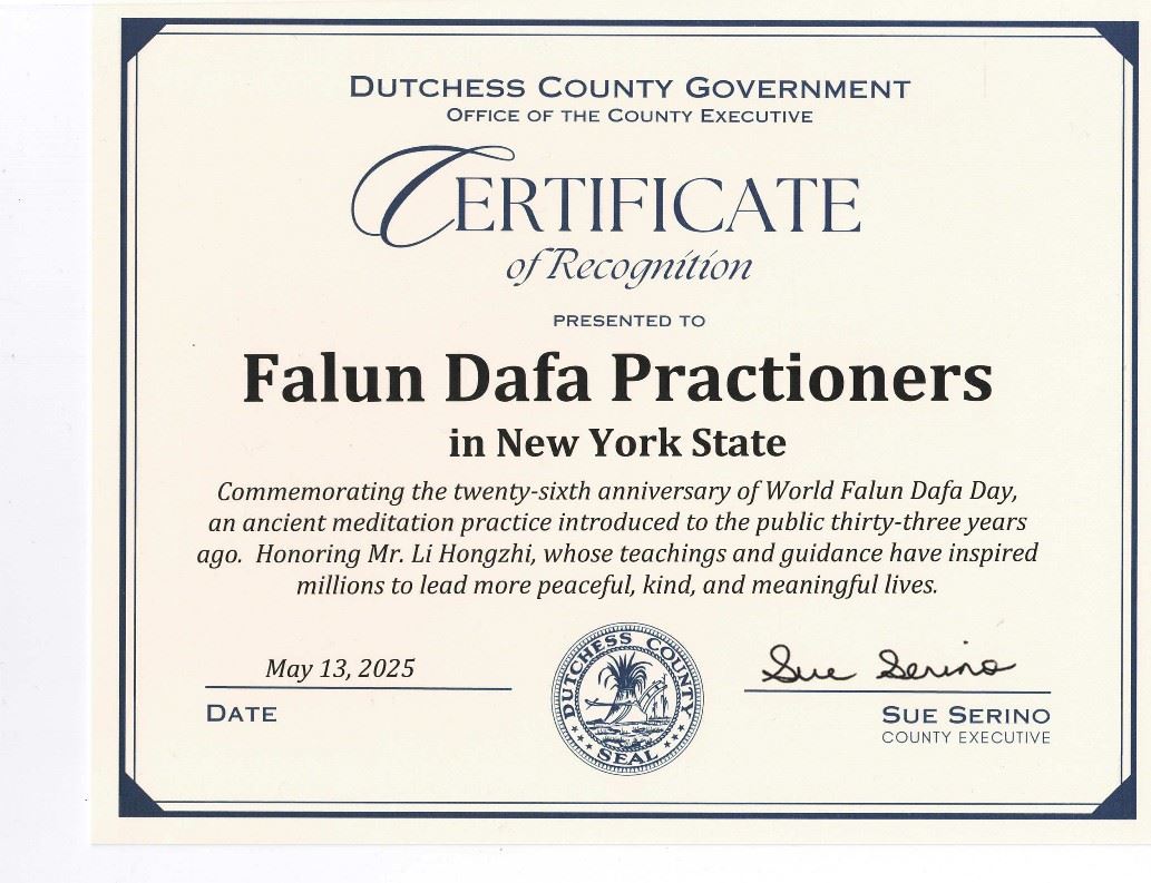 紐約州多個縣市鎮的行政長官發來褒獎賀信,祝賀「第二十六屆世界法輪日」,其中橙縣(Orange County)、蘇福克(Suffolk County)和拿騷(Nassau County)三縣,斯克內克塔迪(City of Schenectady)和米德爾敦(City of Middletown)兩市, 及蘇福克縣的巴比倫 (Town of Babylon)和艾斯利普(Town of Islip)兩鎮,均發表公告宣布二零二五年的五月十三日為當地的「法輪大法日」。達奇斯縣(Dutchess County) 縣長蘇﹒塞裏諾(Sue Serino)褒獎「李洪志先生的教導和指引激勵了數百萬計的人們追求更加平和、善良且富有意義的人生。」