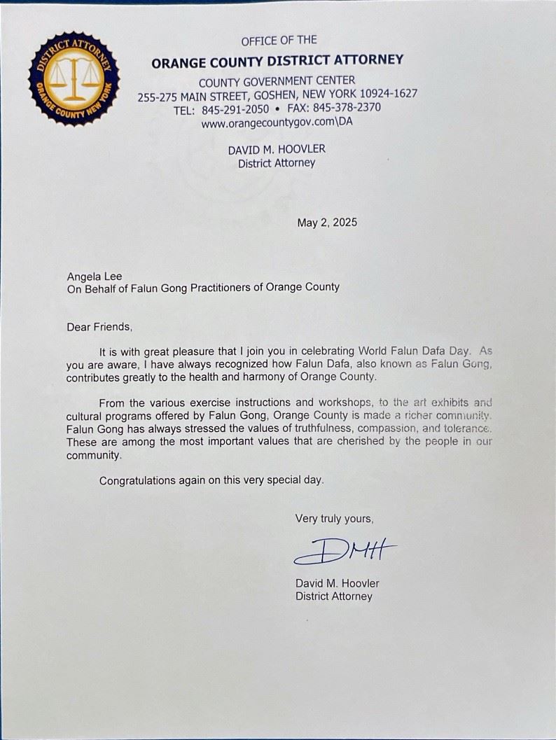 橙縣地方檢察官大衛﹒M﹒胡夫勒(David M. Hoovler)發來賀信,賀信中寫道: