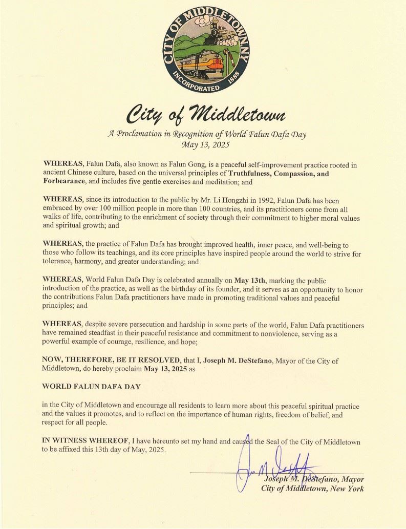 橙縣的米德爾敦市(Middletown)市長約瑟夫﹒德斯特法諾(Joseph M. DeStefano)亦宣告二零二五年五月十三日為該市的「世界法輪大法日」。