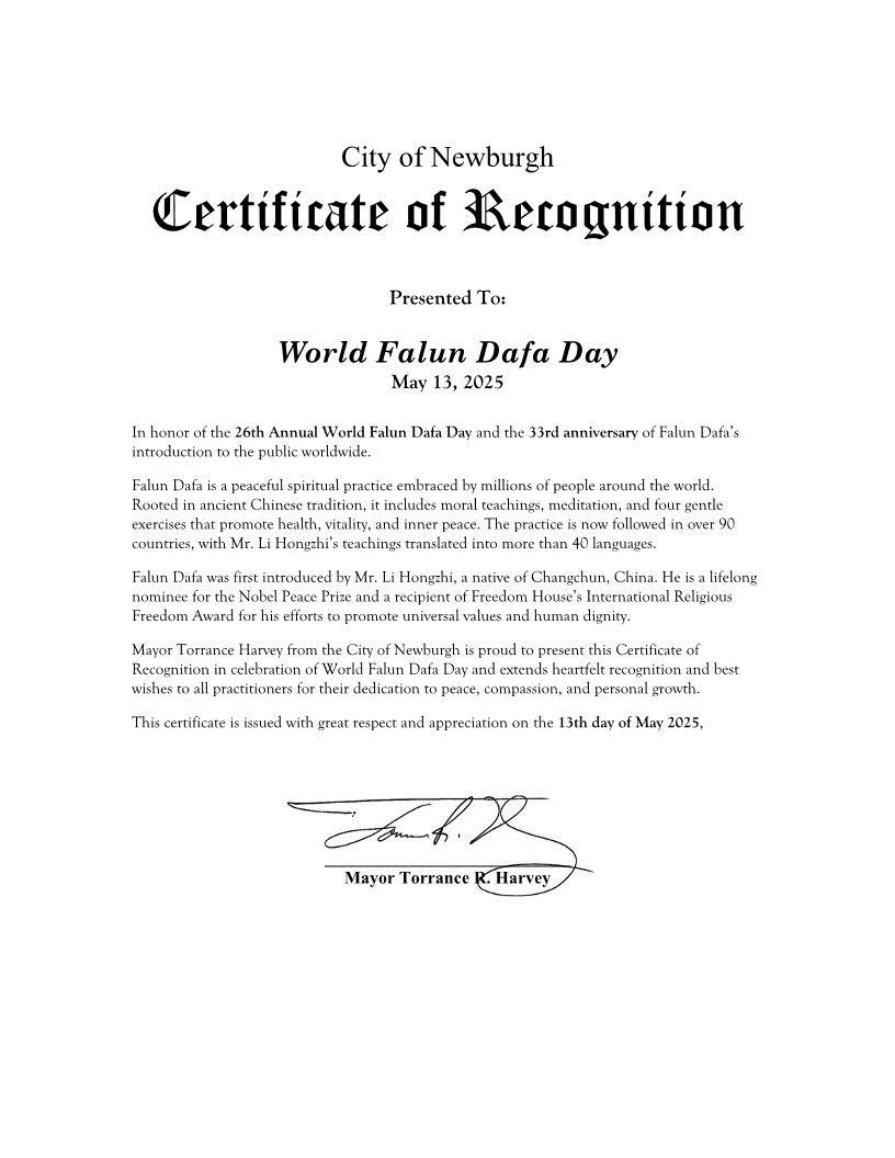 橙縣紐堡市(Newburgh)市長托倫斯﹒哈維(Torrance R. Harvey)亦簽發表彰證書,「致敬第二十六屆世界法輪大法日暨法輪大法全球弘傳三十三週年」。