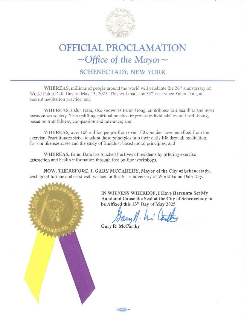 紐約州府地區斯克內克塔迪縣的斯克內克塔迪市(Schenectady)的市長加裏‧麥卡錫(Gary R. McCarthy)簽發褒獎令,宣布二零二五年五月十三日為該市的「法輪大法日」,