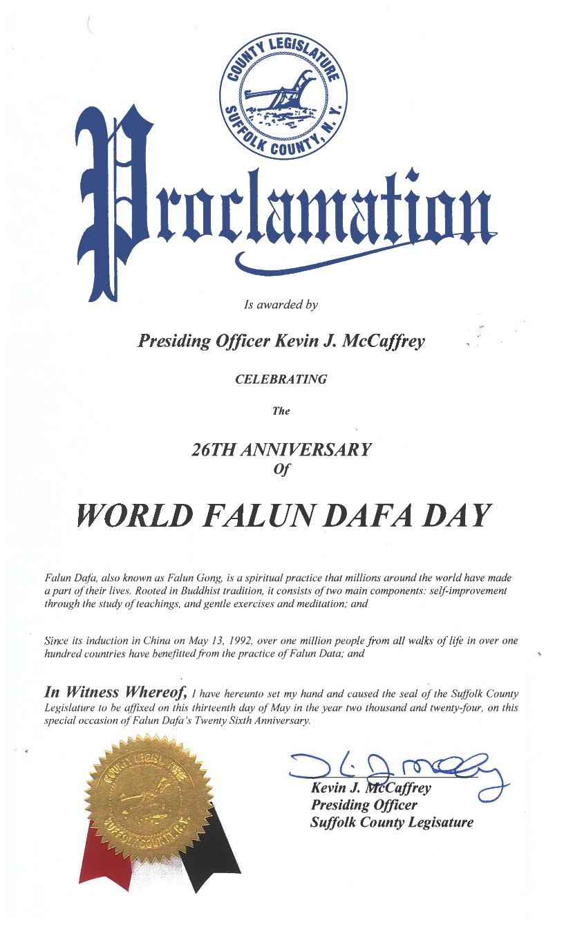 蘇福克縣議會議長、第14選區縣議員凱文‧麥卡弗裏(Kevin McCaffrey)頒發褒獎,慶賀第二十六屆世界法輪大法日。
