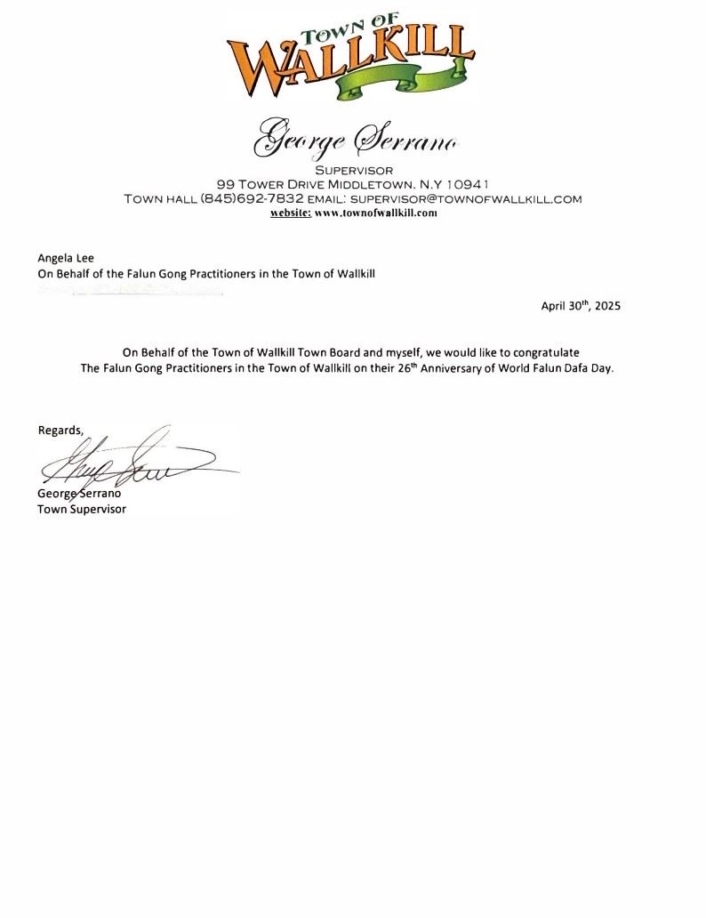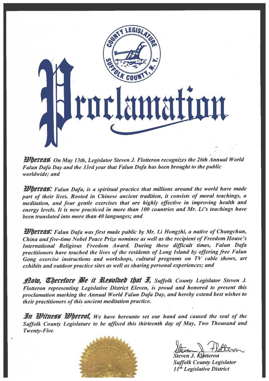 「為表彰法輪大法對健康、和平和道德價值觀所做出的深遠貢獻,我榮幸地宣布二零二五年五月十三日為蘇福克縣的世界法輪大法日。我衷心感謝所有法輪大法修煉者用心投入於提升自己、改善周圍世界,並鼓勵所有居民深思這門修煉所倡導的普世價值。