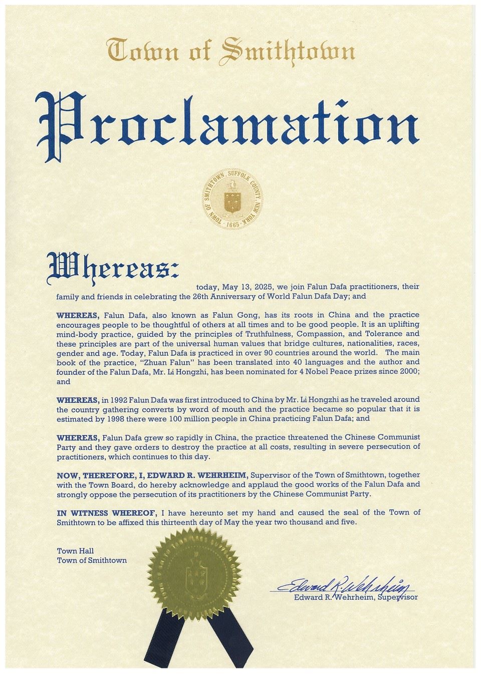 蘇福克縣史密斯敦鎮(Town of Smithtown)鎮長愛德華﹒R﹒維爾海姆(Edward R. Wehrheim)代表該鎮頒贈褒獎令,茲與鎮委會共同頌揚法輪大法的善行,並強烈反對中共對其修煉者的迫害。