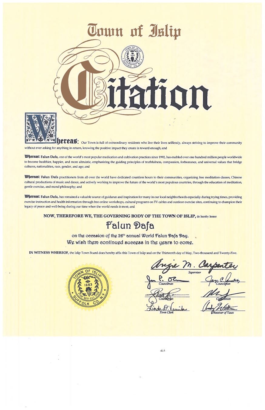 蘇福克縣艾斯利普鎮(Town of Islip)鎮長安吉‧卡彭特(Angie M. Carpenter)攜該鎮全體議員──瓜德隆(Jorge Guadrón)、麥考維(Michael J. McElwee Jr.)、洛倫佐(John M. Lorenzo)和奧康納(James P. O』Connor)聯署褒獎令,致敬法輪大法。