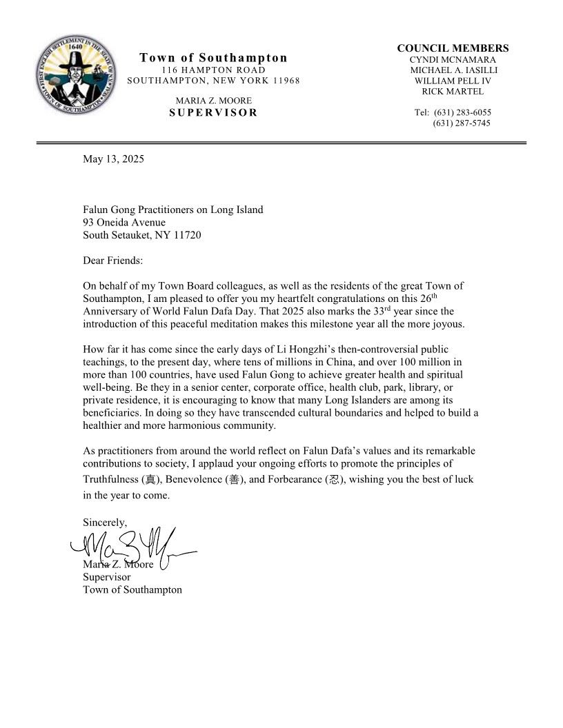 蘇福克縣南安普敦鎮(Town of Southampton)鎮長瑪麗亞‧Z‧摩爾(Maria Z. Moore)發來賀信表示:「我代表鎮委會同仁以及偉大的南安普敦鎮居民,衷心祝賀你們迎來第二十六屆世界法輪大法日。二零二五年同時也是這門祥和功法弘傳三十三週年,為這個里程碑式的年份更添喜悅。」
