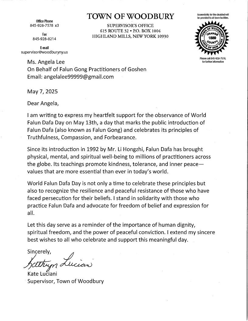 橙縣伍德伯裏鎮(Town of Woodbury)鎮長凱瑟琳﹒盧西亞尼(Kathryn Lucian)發來賀信慶祝「世界法輪大法日」。