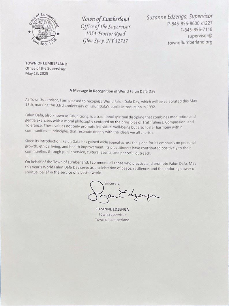 橙縣文化旅遊古鎮倫伯蘭鎮(Town of Lumberland)鎮長蘇珊﹒艾德讚加(Suzanne Edzenga)在「世界法輪大法日致信」中寫道:「作為鎮長,我很高興能夠慶祝世界法輪大法日──今年的五月十三,標誌著法輪大法自一九九二年以來公開傳出三十三週年。