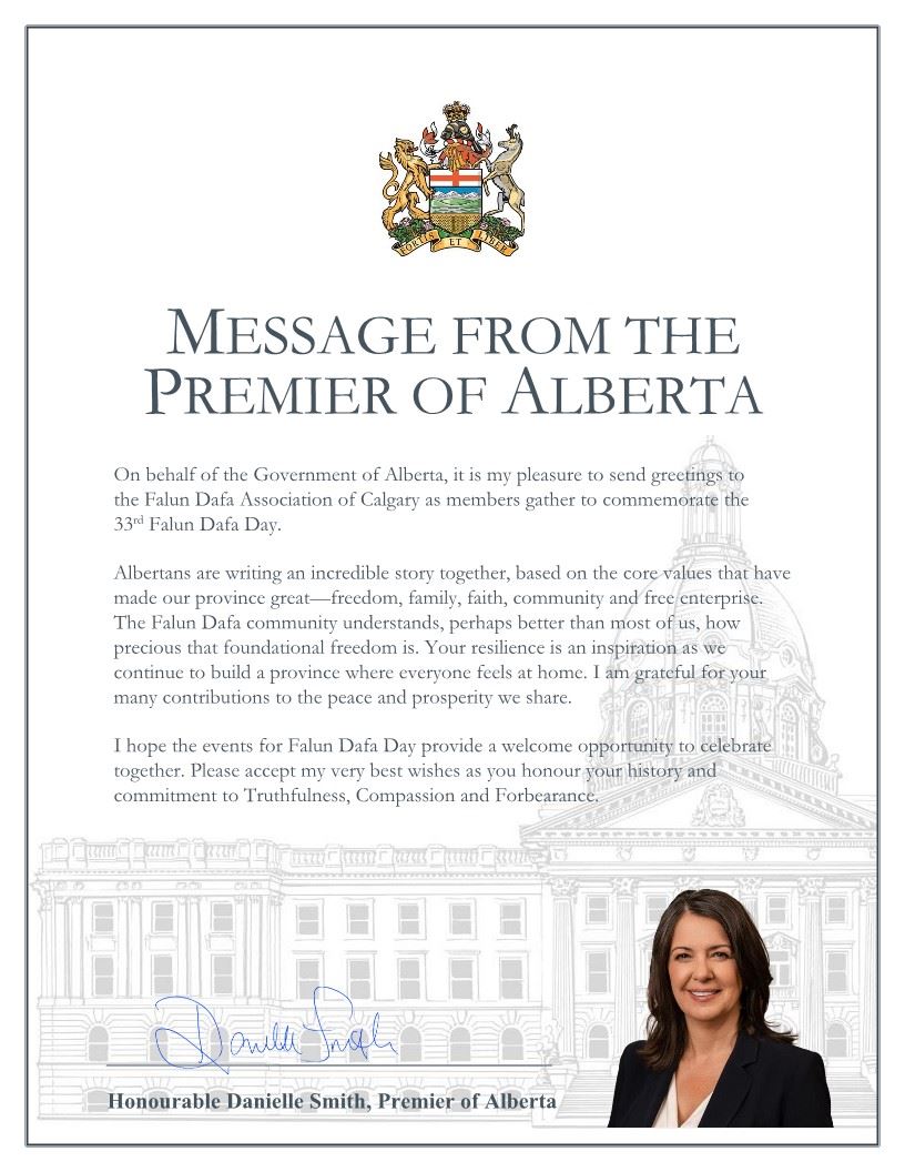 亞伯塔省省長史密斯(Danielle Smith)賀信寫道:「謹代表亞省政府,向法輪大法學會致以誠摯的問候。」