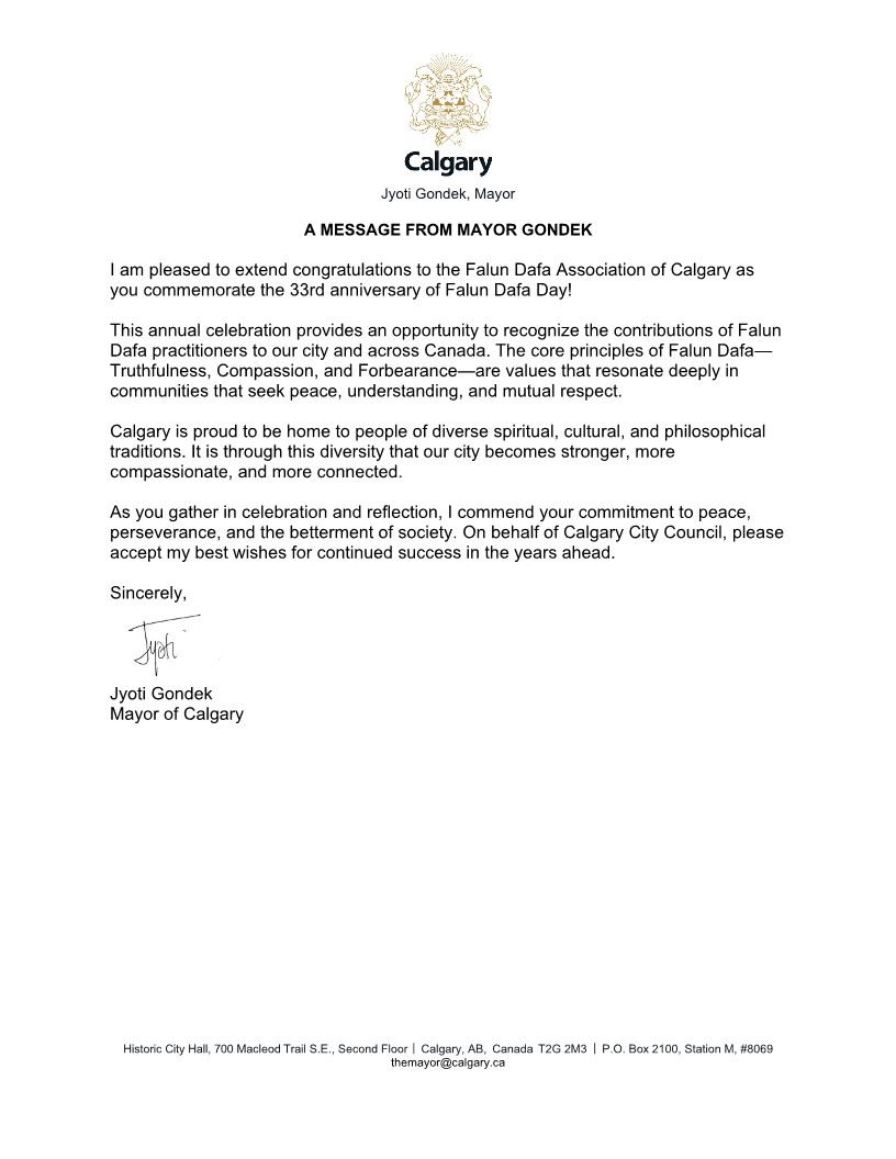 亞省最大城市卡爾加裏的市長貢德克(Jyoti Gondek)的賀信表示:「謹向法輪大法學會致以熱烈祝賀!」