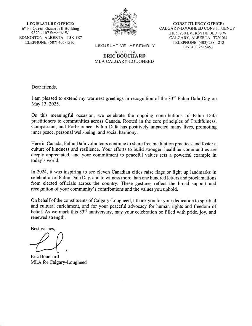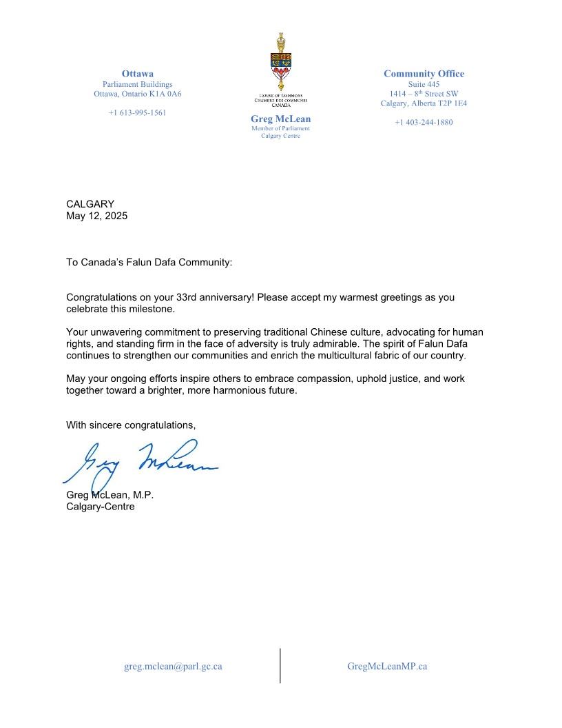 卡爾加裏中心選區國會議員麥克萊恩(Greg McLean)的賀信中提到:「祝賀法輪大法弘傳三十三週年,值此里程碑之際,請接受我最誠摯的問候。」