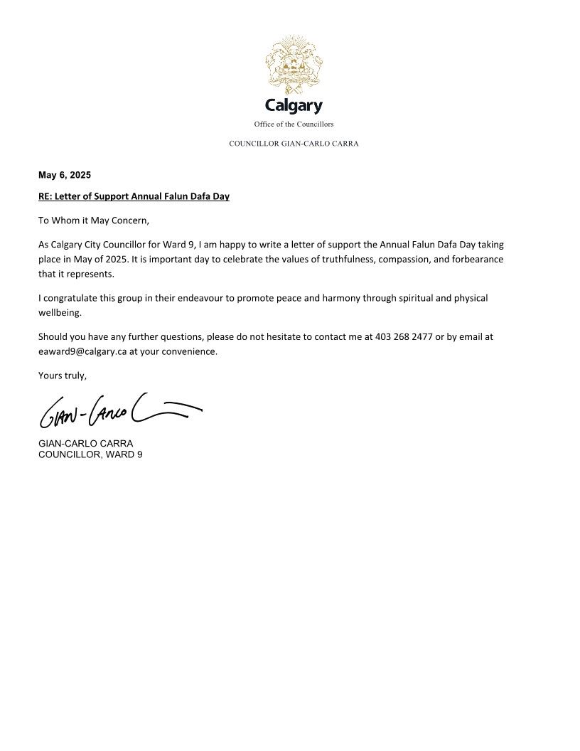 卡爾加裏第九選區市議員卡拉(Gian-Carlo Carra)表示,「很高興寫信支持2025年5月舉行的年度法輪大法日活動。這是慶祝法輪大法所代表的『真、善、忍』價值觀的重要日子。」他感謝法輪大法團體「通過身心健康促進安樂與諧和的努力」。
