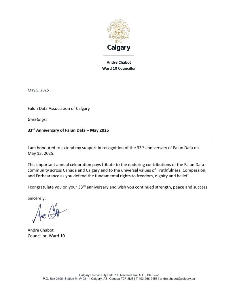 卡爾加裏第十選區市議員查博特(Andre Chabot)賀信中說:「很榮幸表達我的支持。」