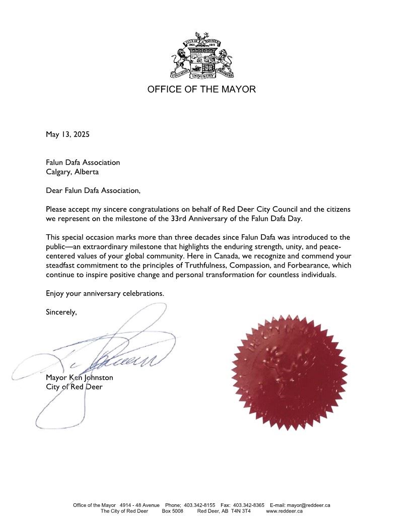亞省第三大城市──紅鹿市市長約翰斯頓(Ken Johnston)寫道:「法輪大法弘傳三十週年這一非凡的里程碑,彰顯了全球法輪大法社群的堅韌、團結,以及和平的價值觀。在加拿大,我們認可並讚揚你們對真、善、忍原則的堅守,這些原則持續激勵著無數人提升自己,變成更好的人。」
