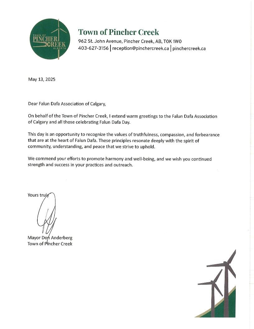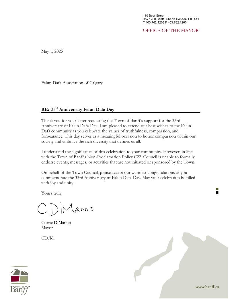 班芙鎮鎮長迪曼諾(Corrie DiManno)向法輪大法學員「致以最誠摯的祝福、最熱烈的祝賀」。她表示,「這是一個意義非凡的日子,讓我們弘揚良善,擁抱我們豐富的多元性。」