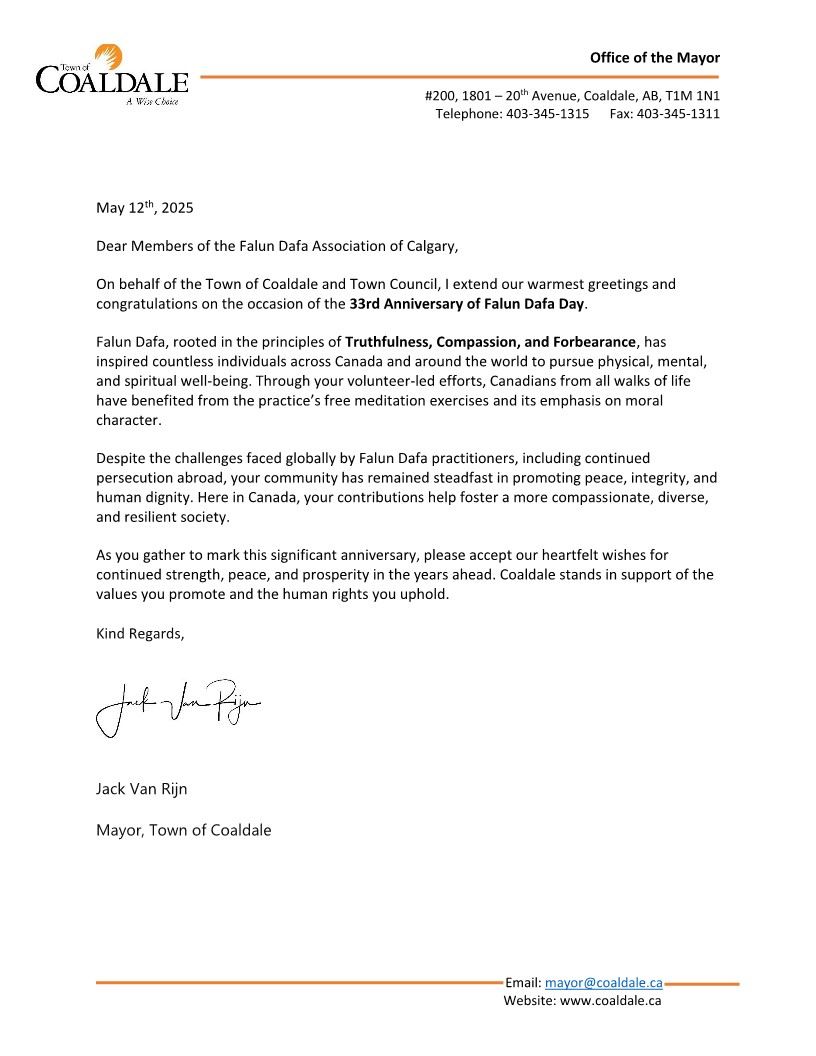 科爾代爾鎮鎮長范瑞恩(Jack Van Rijn)在賀信中高度讚揚法輪大法,「法輪大法以真、善、忍為原則,激勵了加拿大乃至全世界無數的民眾追求身、心、靈的健康。法輪功免費教功,強調道德品性,通過志願者的努力,各行各業的加拿大人都從中受益。」