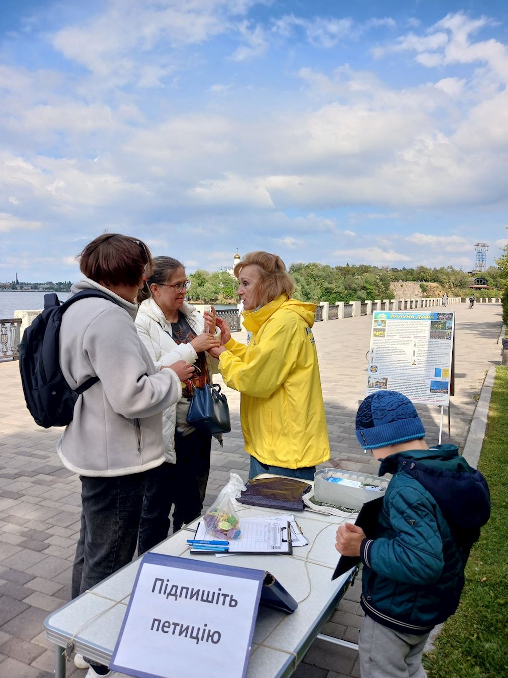 當地居民塔蒂亞娜(Tatiana)是一位廣告經理,她和當體育教師的女兒瑪麗亞(Maria)在散步時看到學員們舉辦的活動。學員送給她們小蓮花──這是修煉者純潔心靈的象徵。