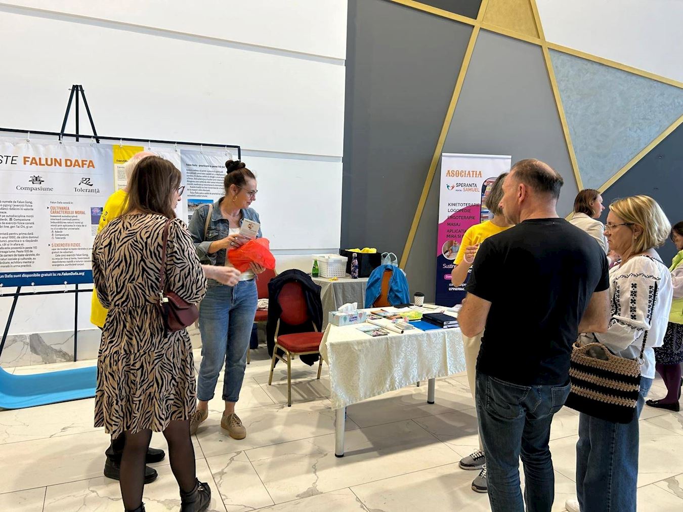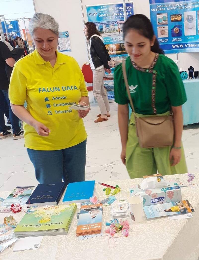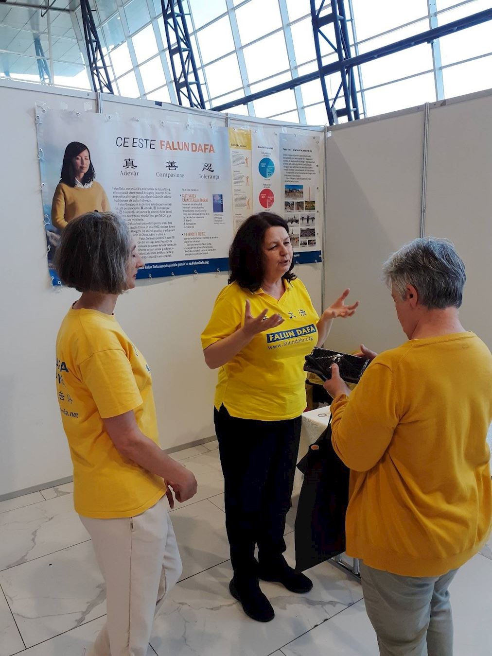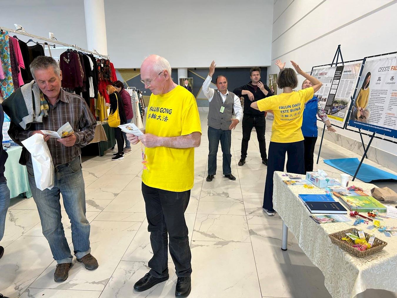 在法輪功展位前,學員們向感興趣的民眾介紹法輪功功法,並告訴他們蒂米什瓦拉煉功點的信息,每週日上午十點,學員們在植物園義務教功。活動期間,學員們還向人們發放介紹法輪大法修煉使人受益的資料和傳單,並介紹了大法在中國廣傳的盛況,在短短幾年內,就有超過七千萬中國人開始修煉法輪大法。