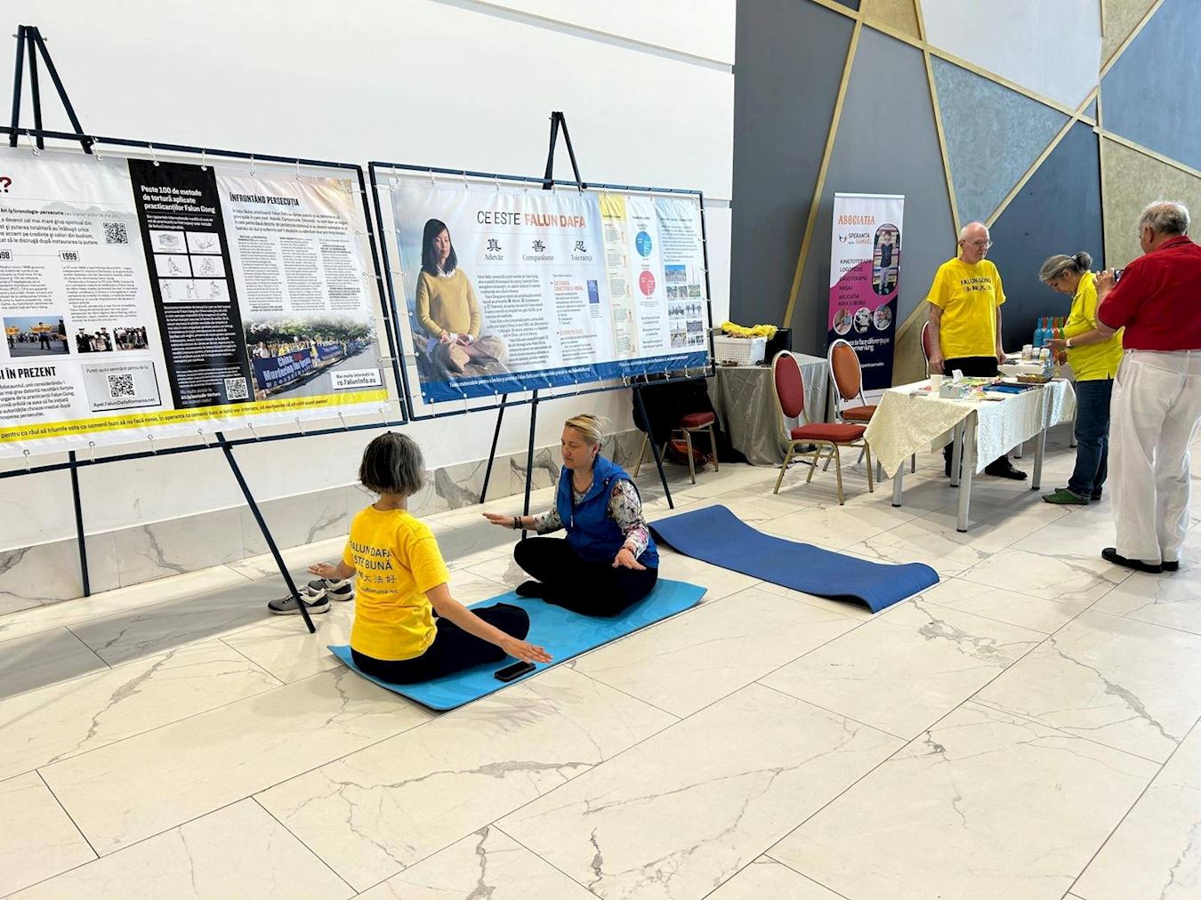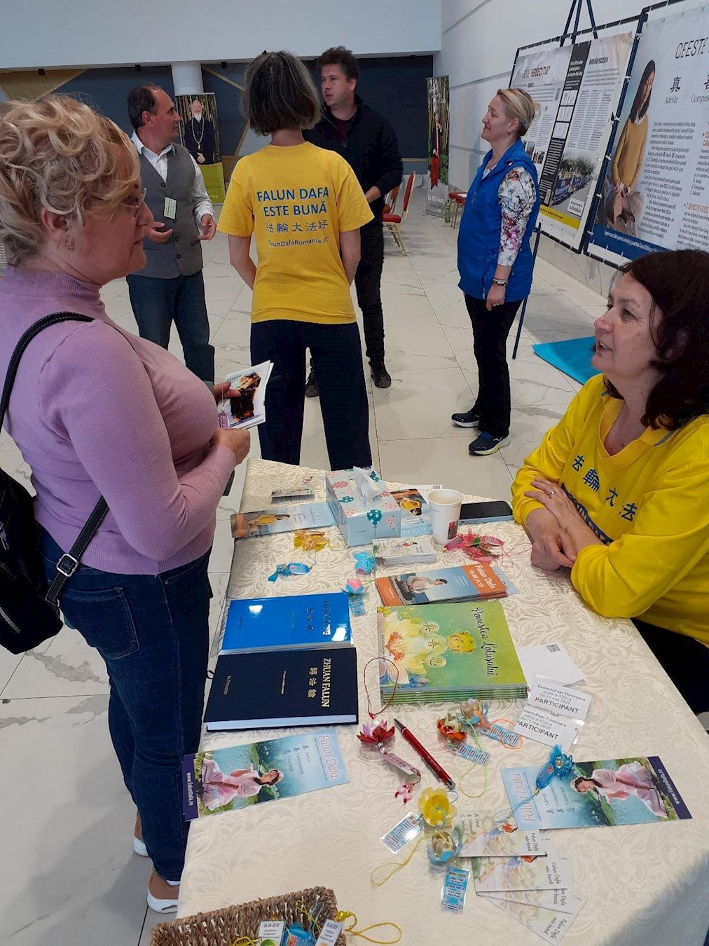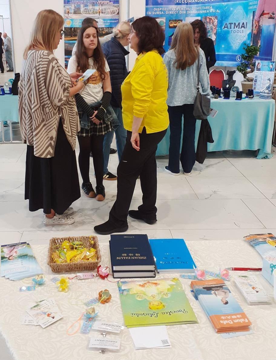在法輪功展位前,學員們向感興趣的民眾介紹法輪功功法,並告訴他們蒂米什瓦拉煉功點的信息,每週日上午十點,學員們在植物園義務教功。活動期間,學員們還向人們發放介紹法輪大法修煉使人受益的資料和傳單,並介紹了大法在中國廣傳的盛況,在短短幾年內,就有超過七千萬中國人開始修煉法輪大法。