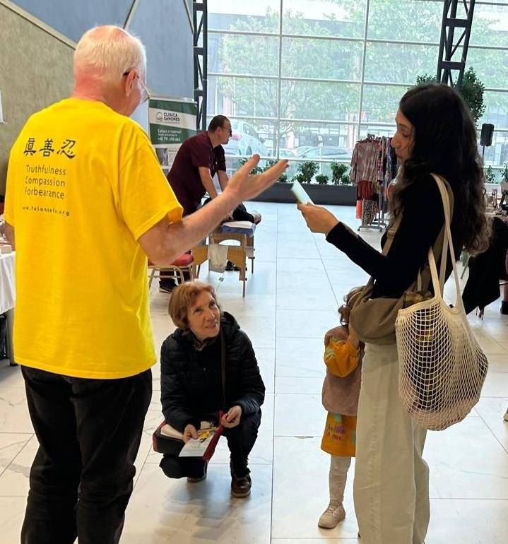 一位先生徑直走到一位法輪功學員面前,詢問中共對法輪功的迫害。他問到:「這是在中國有人因修煉而被(中共)迫害的那個功法嗎?現在(迫害)還在繼續嗎?」 他向學員詳細了解了中共迫害法輪功的情況,也了解法輪大法這一修煉方法。活動期間,他每天都會來到法輪功展位前說:「我希望(中共)那些暴行早日結束。」