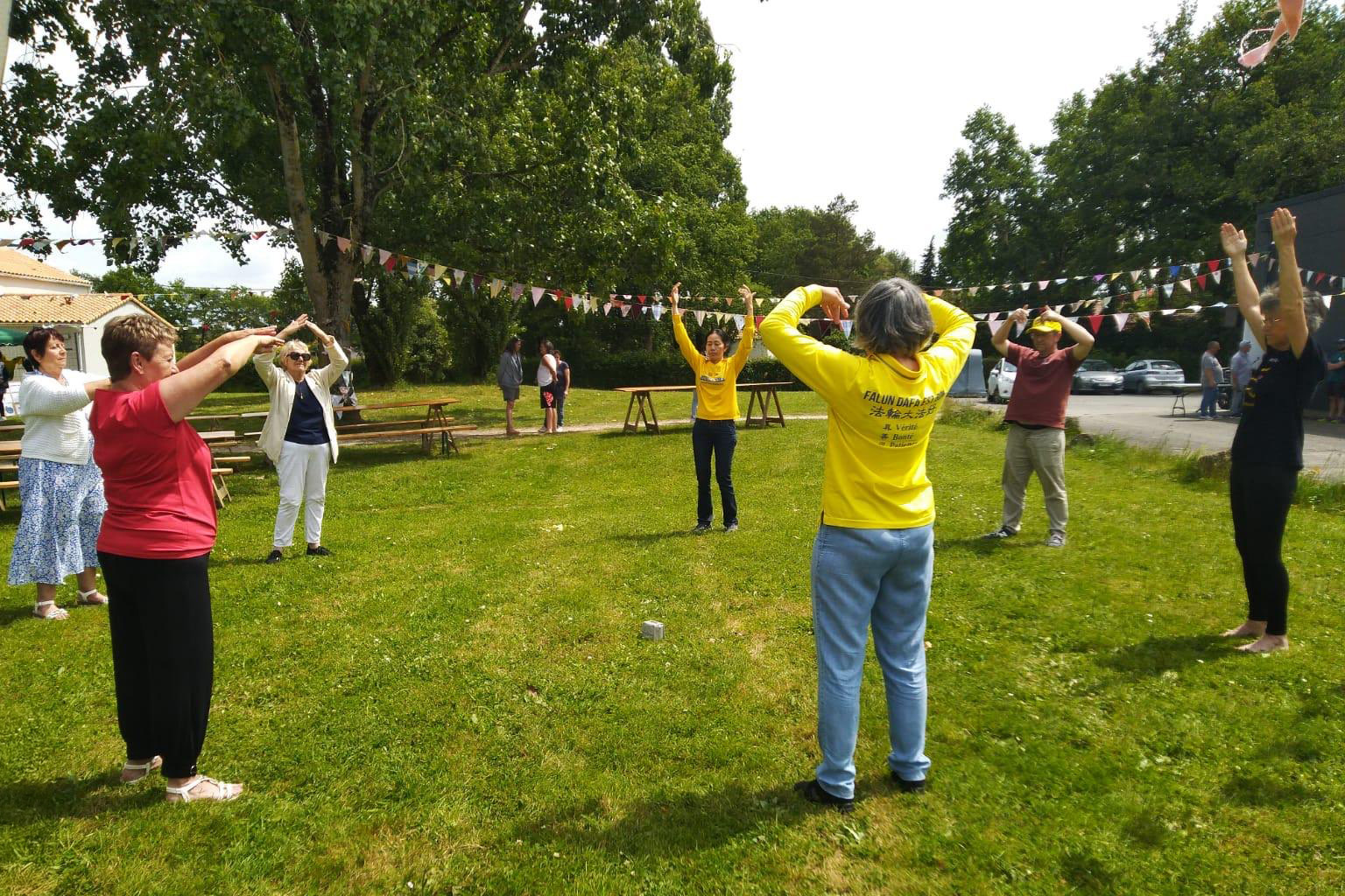 ![]() 圖5~6:在帕盧(Palluau)市五月二十四日舉辦的協會論壇上,法輪功學員向到訪者教授法輪功功法。 |