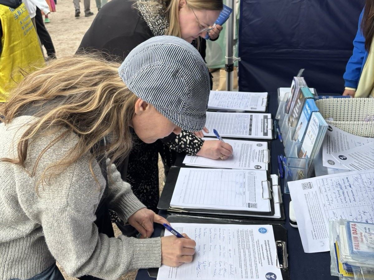 大多數人在聽到中共活摘法輪功學員器官的真相後深感震驚,並立即簽署請願書支持制止迫害。一對芬蘭情侶聽到迫害的內容後感到震驚。那位女生震驚得多次倒吸一口氣,他們表示能從法輪功學員身上感受到平和,實在無法理解中共竟能作出如此邪惡的事,活摘修煉者的器官。他們認為,任何人都不應受到如此對待。兩人感謝學員告訴他們這些真相,並非常喜歡贈送的蓮花。