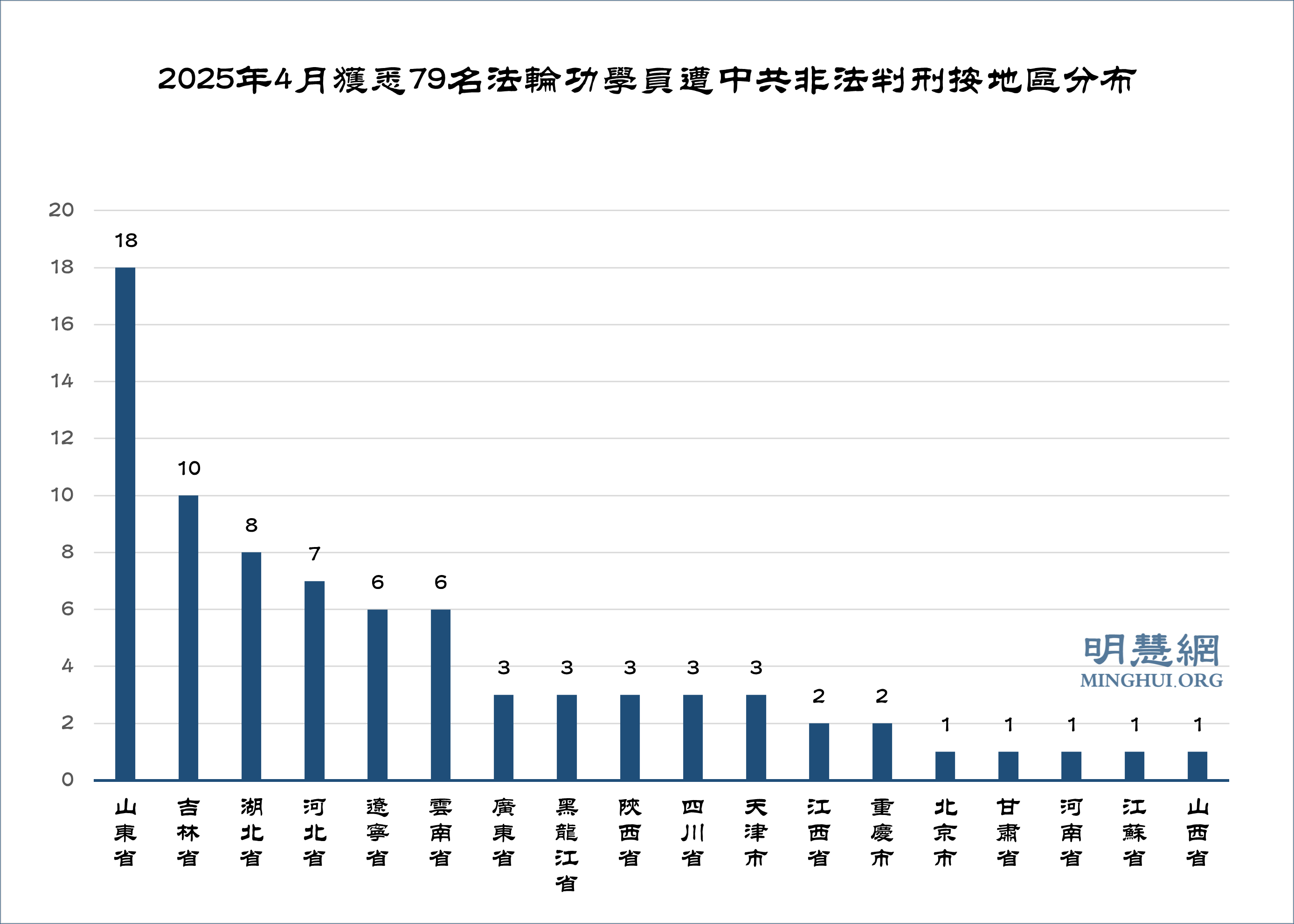 據明慧網報導統計,獲知四月份有79名法輪功學員被非法判刑。其中,山東省18人,吉林省10人,湖北省8人,河北省7人,遼寧省、雲南省各6人。