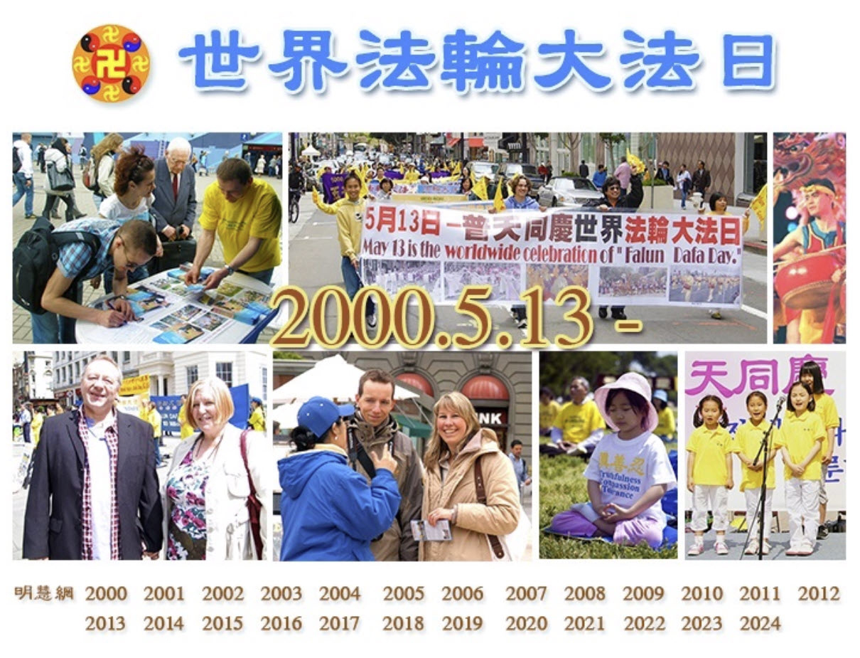 那一年,由十七個法輪大法佛學會發布了第一個法輪大法日的聯合公告,確認法輪大法日的主旨。公告說,「為紀念全人類的偉大節日,為讓世人進一步了解大法,為使有緣人早日得法,為呼籲善良的人們支持大陸弟子早日重獲信仰真理、自由修煉的合法權益……決定將五月十三日訂為『世界法輪大法日』,以便全世界大法弟子和全世界善良民眾共同歡慶。」