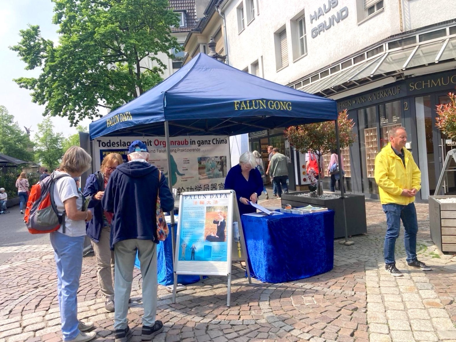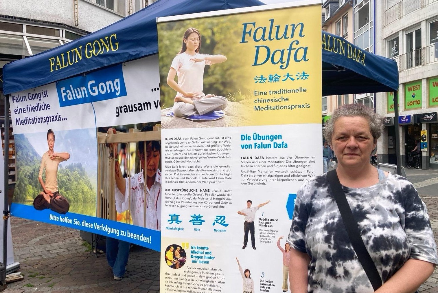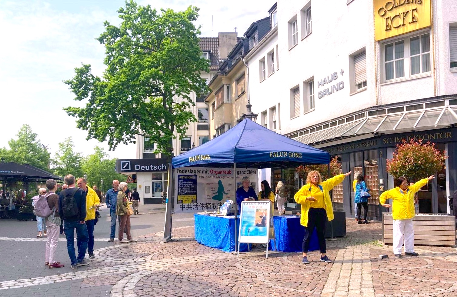有著悠久歷史的錫格堡(Siegburg)坐落在德國北威州科隆附近依山傍水的平原上,與附近喧囂大城市氛圍完全不同。法輪功學員在步行街交叉空地上,豎起介紹法輪功功法展板,掛起揭露中共迫害法輪功的橫幅,部份學員開始隨著音樂煉功。頃刻間,路人都慢下腳步,有人走近展板和信息台,想知道在中國發生了甚麼,想了解學員演示的是甚麼。