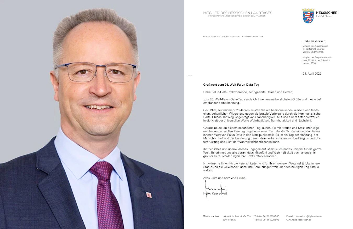 黑森州議會基民盟(CDU)議員海科•卡塞克特(Heiko Kasseckert)發來賀信,誠摯地祝願法輪功學員的慶祝活動圓滿成功。他在信中稱讚,法輪大法日是一個充滿希望和人性光輝的日子。法輪功學員的付出與努力將產生深遠的影響。