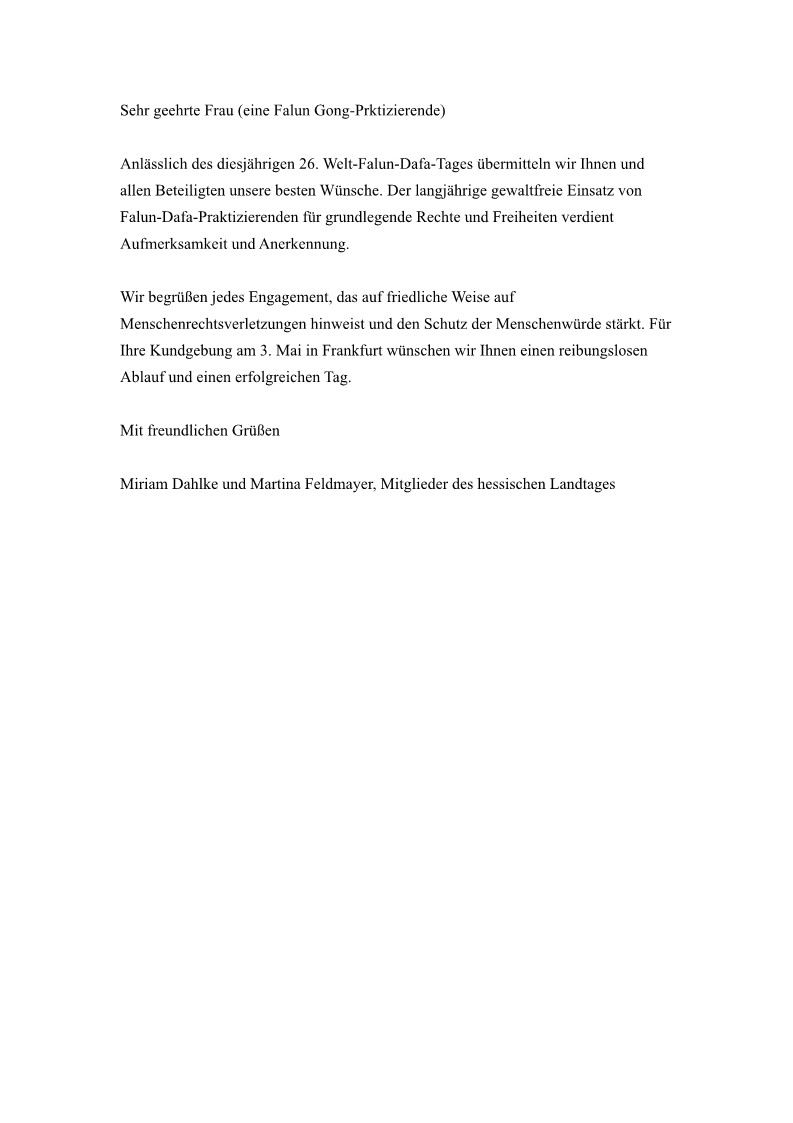 黑森州議會綠黨(Die GRüNEN)兩位女議員馬婷娜•菲爾德邁爾(Martina Feldmayer) 和米莉亞•達爾克(Miriam Dahlke)在賀信中給法輪功學員帶來了美好祝願。