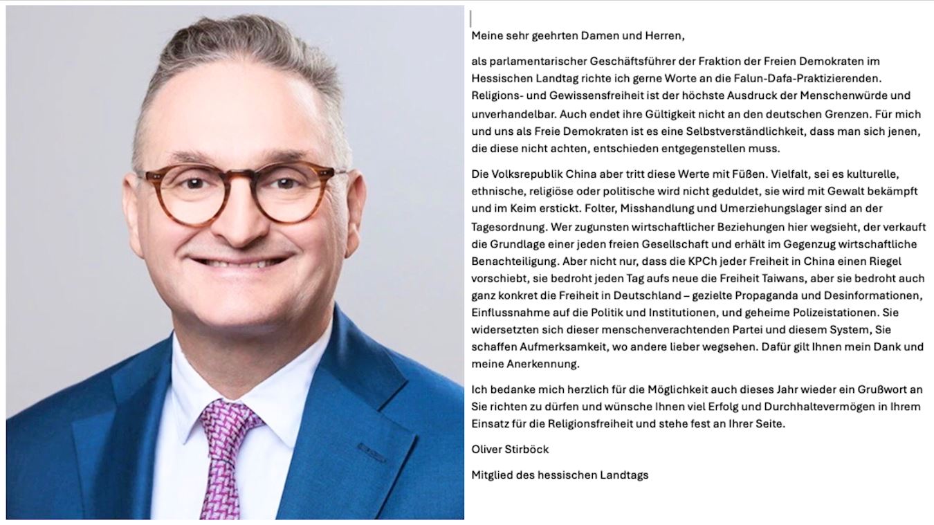 黑森州議員、自由黨(FDP)執行主席奧利弗•斯蒂爾博克(Oliver Stirböck)在賀信中說:「 我衷心的感謝今年再次有機會向你們致辭。祝願法輪功學員在為宗教信仰自由而努力的道路上取得成功,保持堅定。我將始終站在你們一邊。」