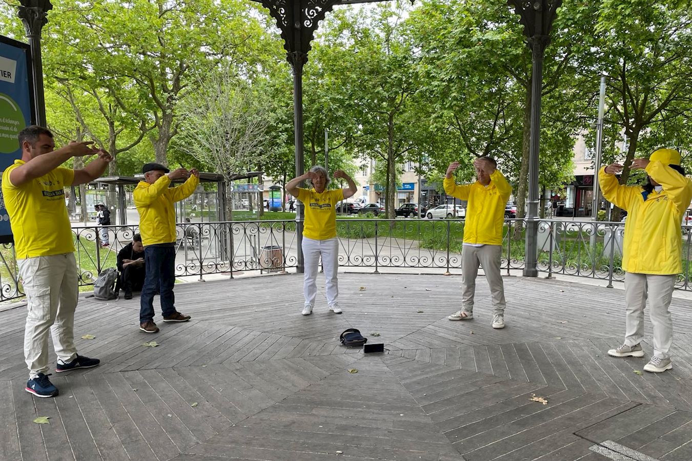 ![]() 圖1~4:二零二五年六月七日,法國西部法輪功學員在於拉羅什市中心的拿破侖廣場上舉辦巡迴講真相活動,除了展示法輪功五套功法,並分發傳單,和遊人駐足了解。 |