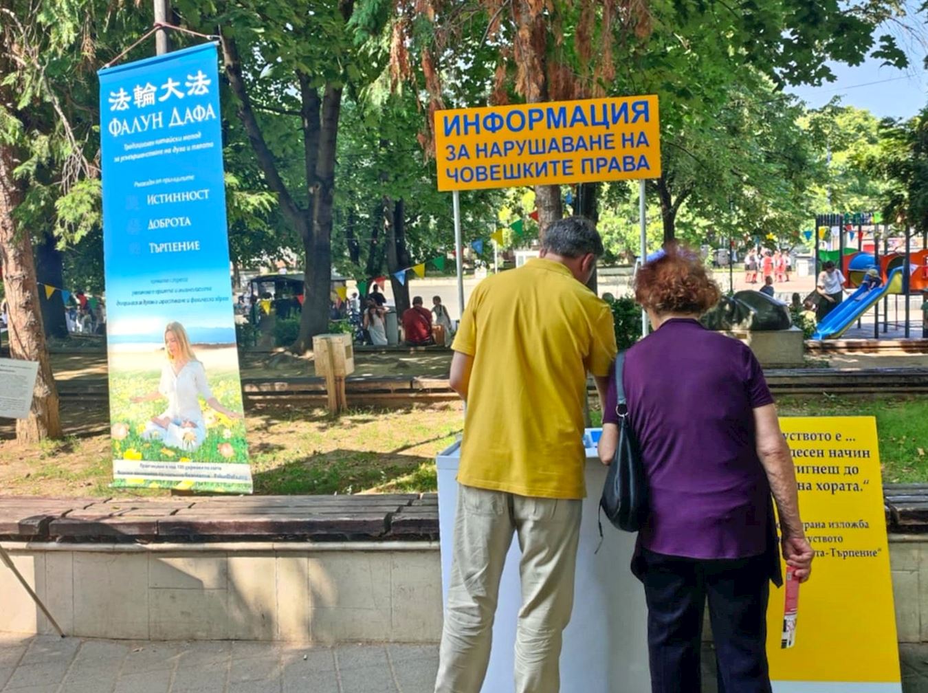 一對年長夫婦駐足良久地觀賞畫作。他們對法輪功學員說,中共對法輪功信仰的迫害讓他們想起了當年保加利亞共產黨對基督徒的打壓。
