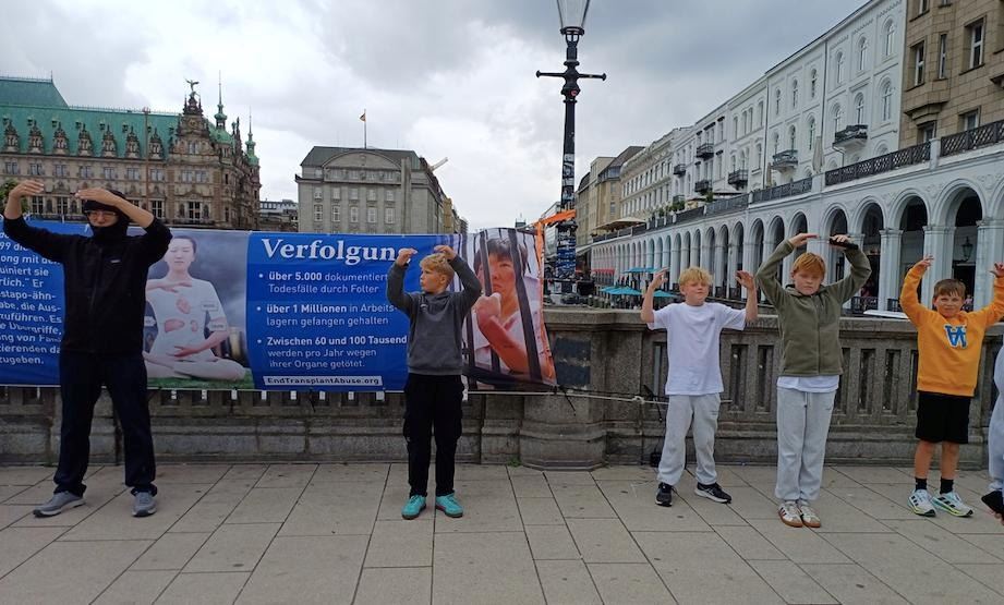 二零二五年六月七日,北德初夏,當地部份法輪功學員們在瑞森壩(Reesendamm)橋上設立了信息站。該橋是連接市中心購物區和步行街的紐帶,眾多的當地人和遊客湧向購物街。人們被法輪功學員的真相海報吸引,駐足了解法輪功的真相。旁邊的法輪功學員們平靜地展示著功法,並向感興趣的路人發放傳單。