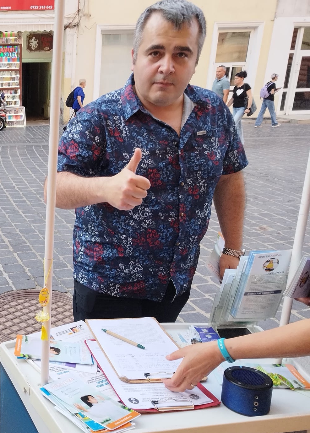 在康斯坦察,一位男士告訴法輪功學員,他在之前學員舉辦的活動中得到了一朵小蓮花。回家後,法輪功遭受中共迫害的事一直縈繞在他的心頭。