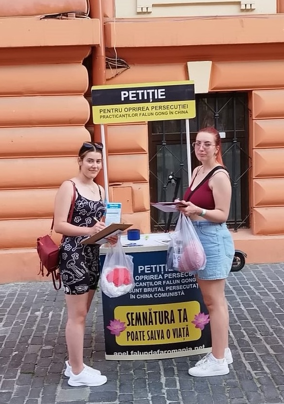 ![]() 圖5:二零二五年六月七日,在布拉索夫,就讀刑事科學碩士課程的法律系學生卡門﹒圖多爾(右)和友人瑪格達﹒拉紮爾支持法輪功。 |