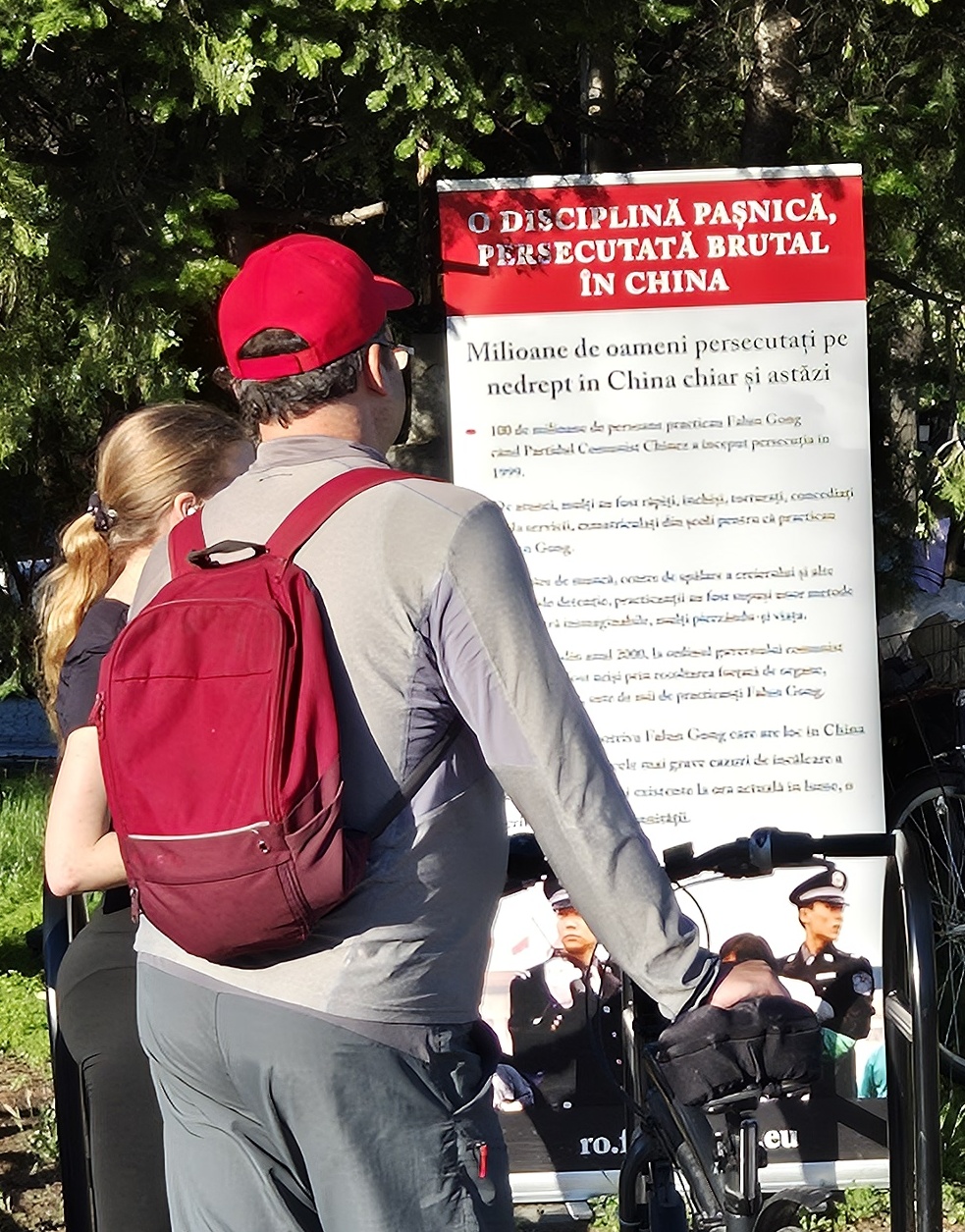 ![]() 圖7:二零二五年五月三十一日,在布加勒斯特,路人駐足閱讀法輪功真相展板。 |