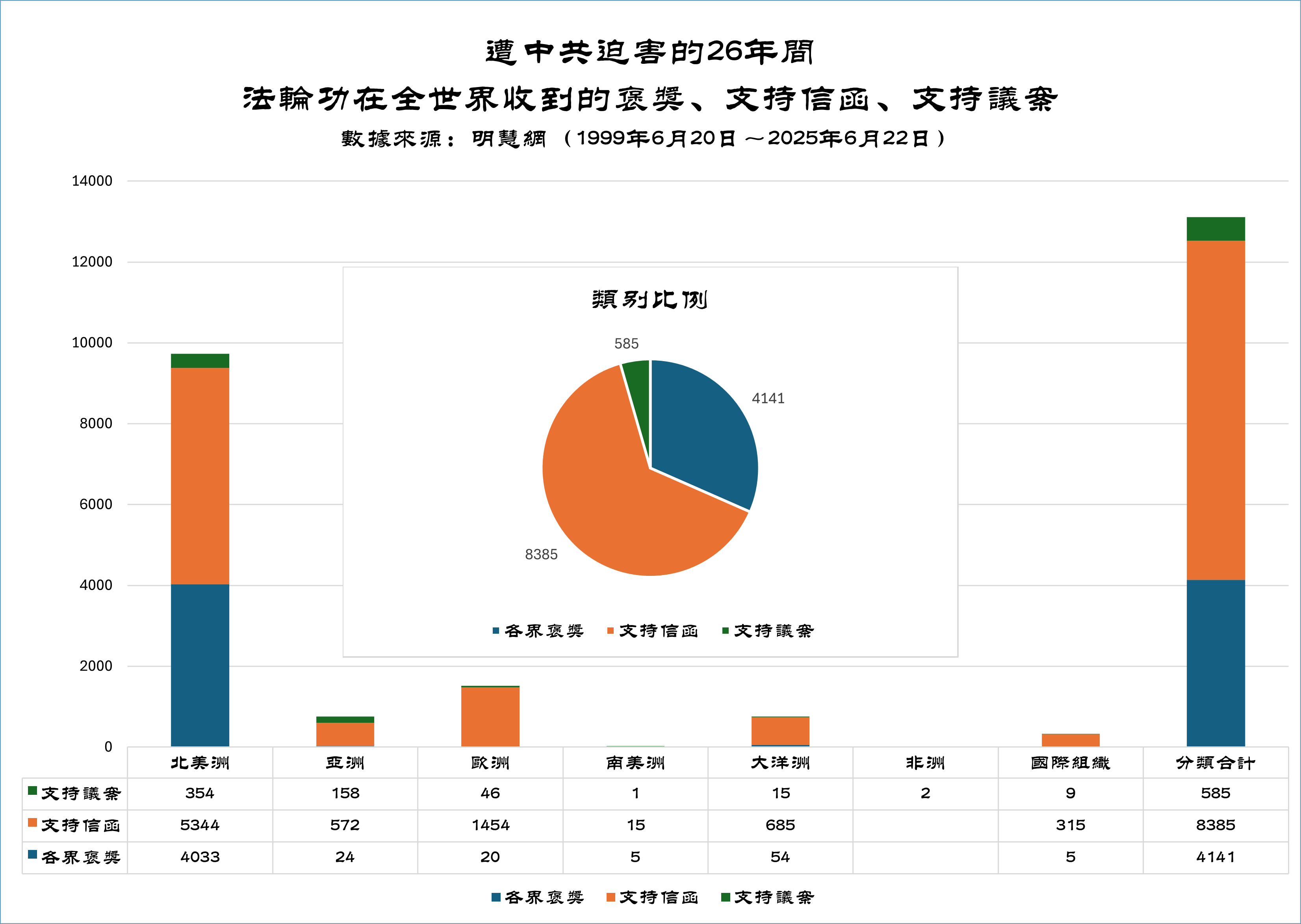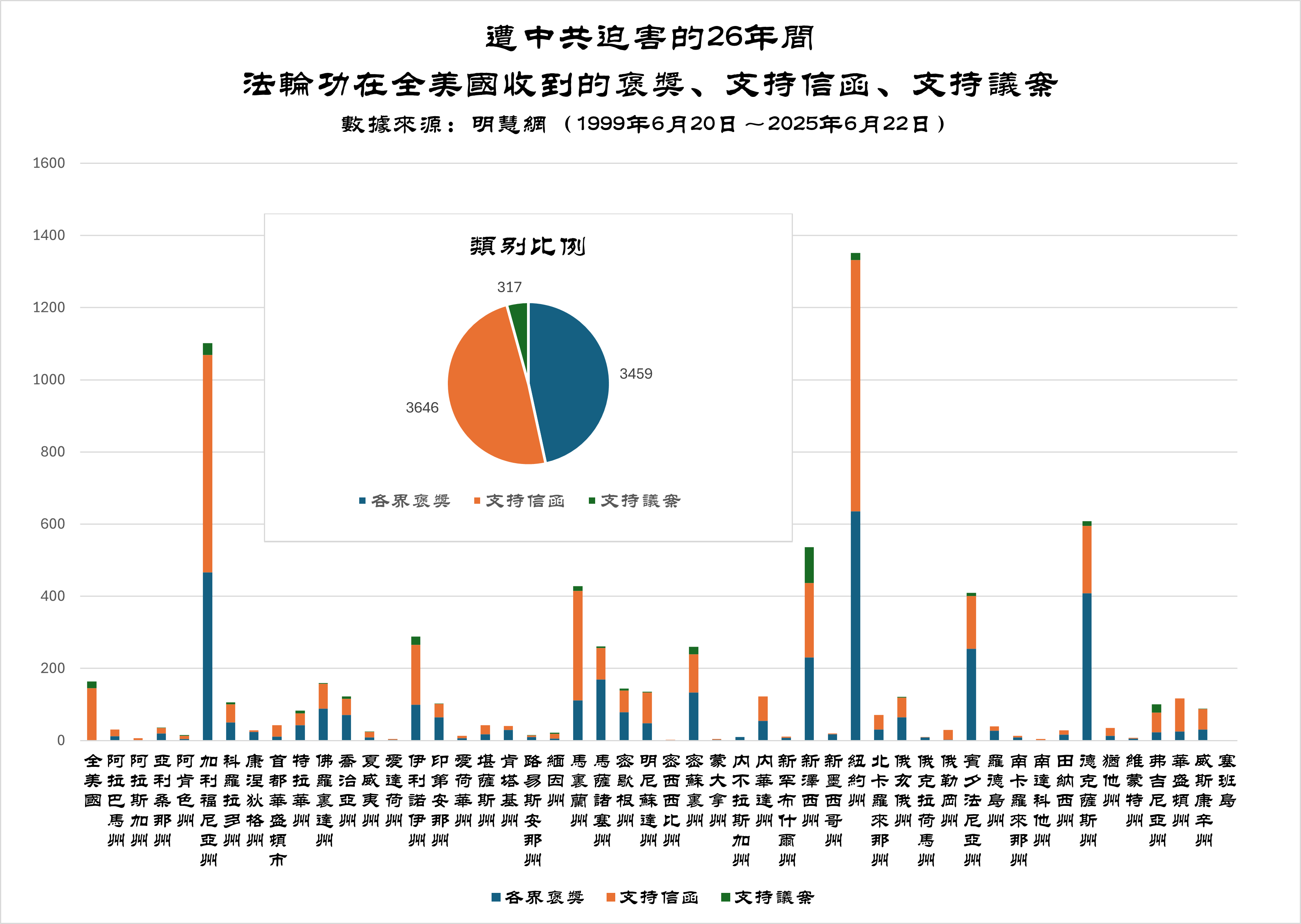 根據明慧網資料,在受迫害的二十六年間,法輪功所收到全世界的褒獎、支持信函、支持議案約一萬三千件。其中,從美國各州及聯邦收到的超過七千四百件,約佔總數的57%。以下分別是全球和全美的統計圖表: