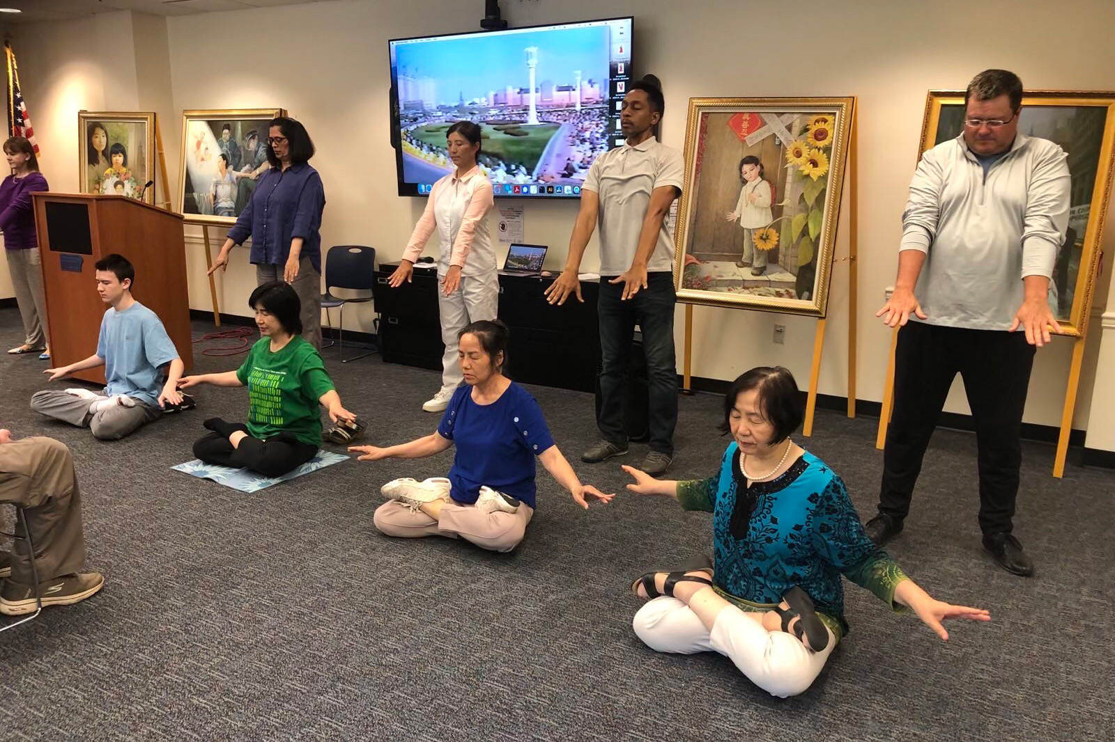 會議由主持人吉姆(Jim)開場,他簡要介紹法輪功是一種以真、善、忍為核心的佛家修煉法門,包含五套緩和的功法,曾在中國廣受歡迎,但自一九九九年起遭中共全面鎮壓。他指出,這場迫害已延伸至美國,包括中共特工對法輪功學員的騷擾、恐嚇及破壞財產等行為,甚至可能透過強迫勞工產品滲入美國零售市場,牽連無辜消費者。