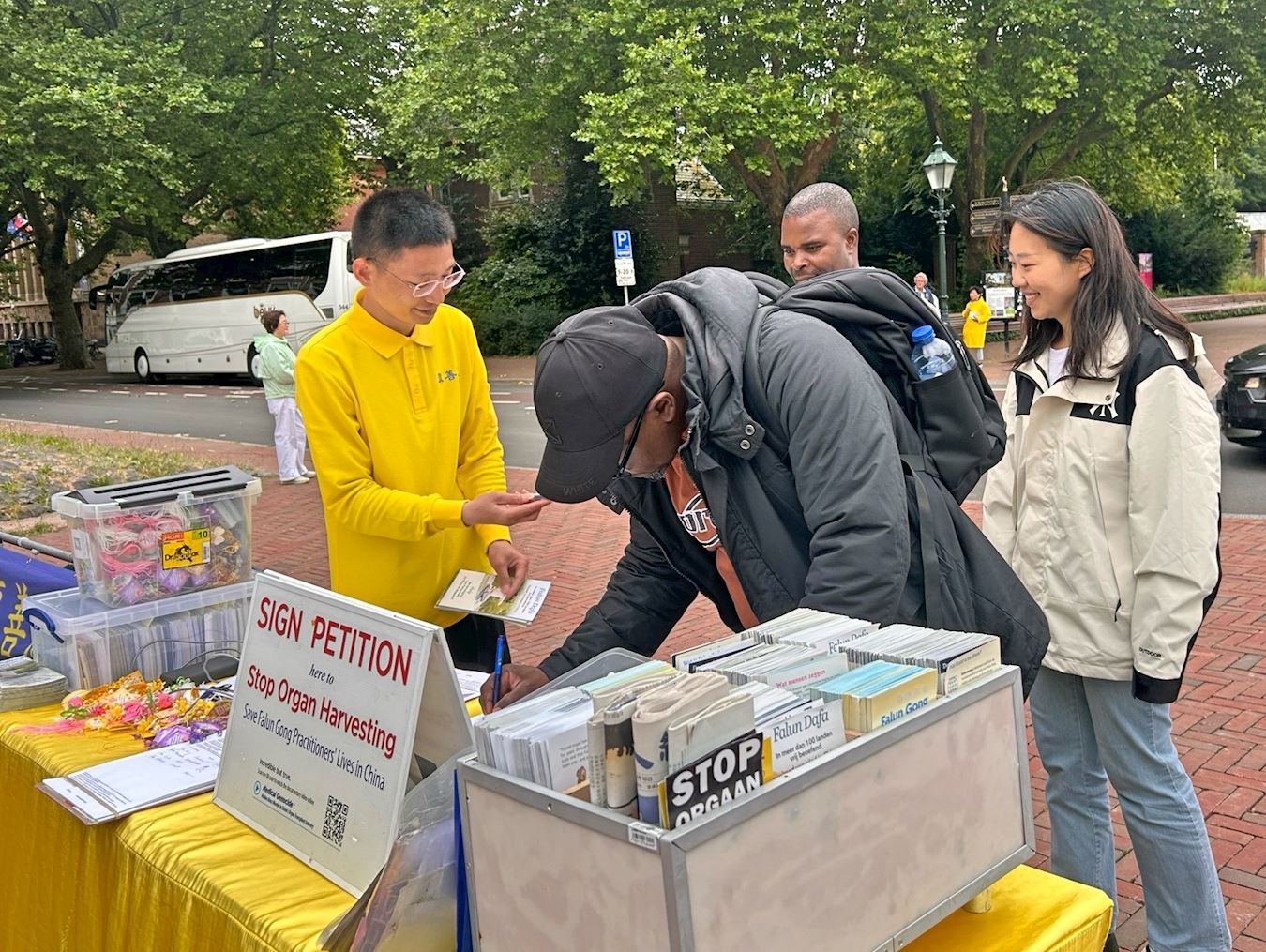法輪功學員在和平宮對面的廣場上懸掛「停止迫害法輪功 停止中共活摘器官」、「立即停止活摘器官虐殺法輪功學員!」以及「真善忍」條幅;他們展示法輪功功法;向過往的遊客及行人派發真相傳單;講述法輪大法的美好和揭露中共對法輪功學員實施的包括活摘器官在內的殘酷迫害罪行。了解真相的人們紛紛在反對中共活摘器官的徵簽表上簽名支持法輪功反迫害。