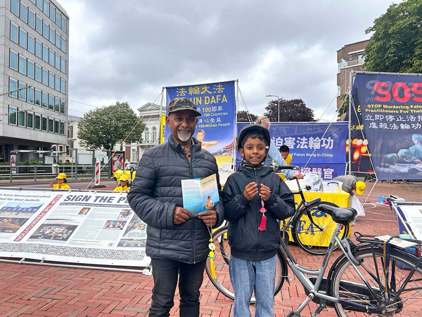 菲拉伊(Hariaum Pherai)先生帶著兒子艾利亞(Ehiaya)騎車經過法輪功學員舉辦反迫害活動地點,被學員祥和的煉功場面吸引,他說自己也練習過瑜珈,他很喜歡法輪功學員的打坐,充滿了靈性,他知道打坐對人的健康有益,當得知這樣的祥和功法在中國被中共禁止並迫害時,他立即簽名支持法輪功反迫害,並說:「我覺得每個人都應該煉,中國政府也應該支持,為甚麼不呢?這樣他們就能有健康的國民。」