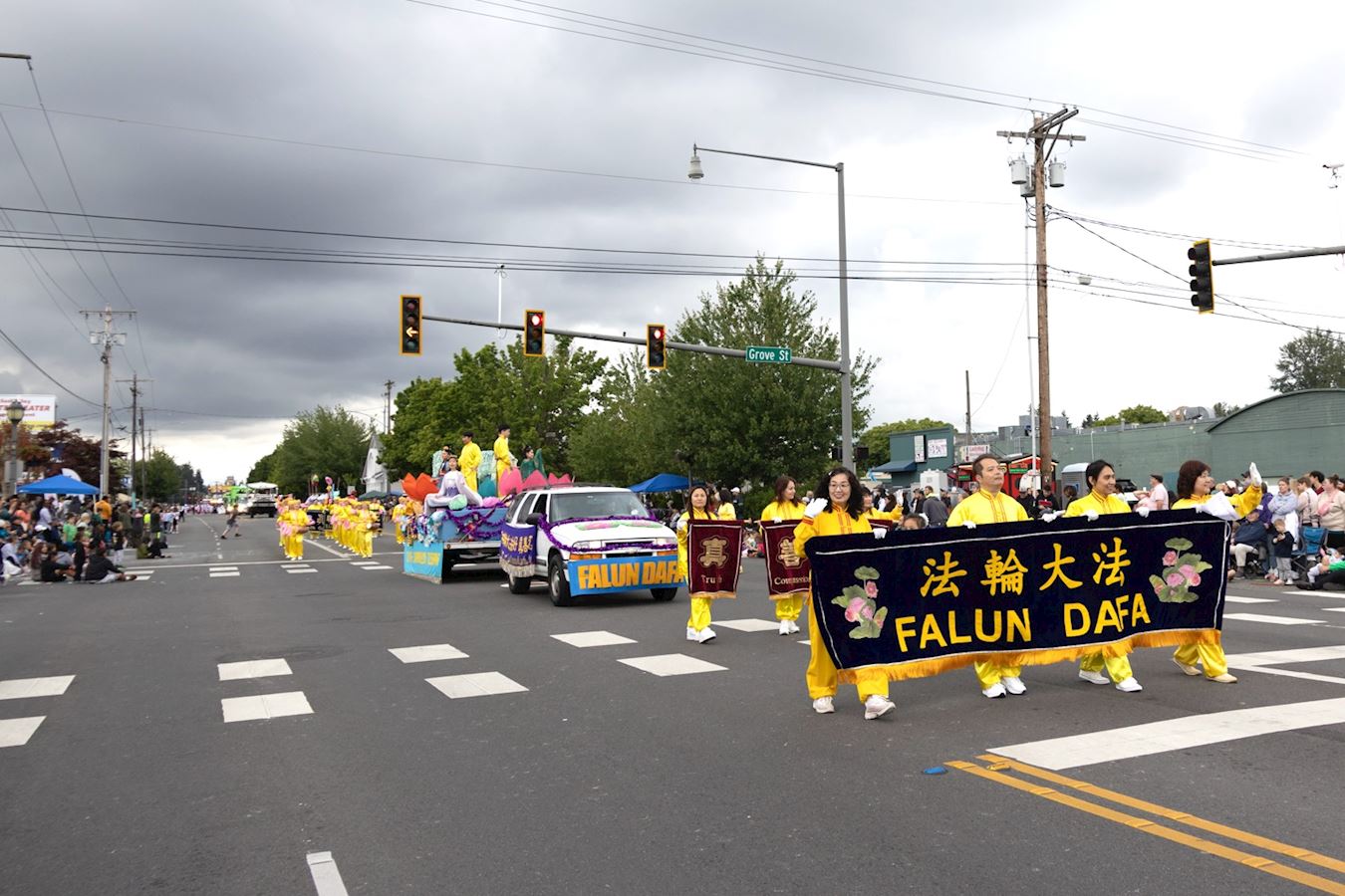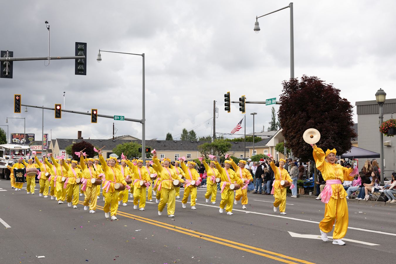 圖1~3:二零二五年六月二十一日,美國西雅圖法輪功學員和來自加拿大溫哥華的部份學員參加了位於西雅圖市北部的瑪麗斯維爾市(Marysville)的草莓節遊行。