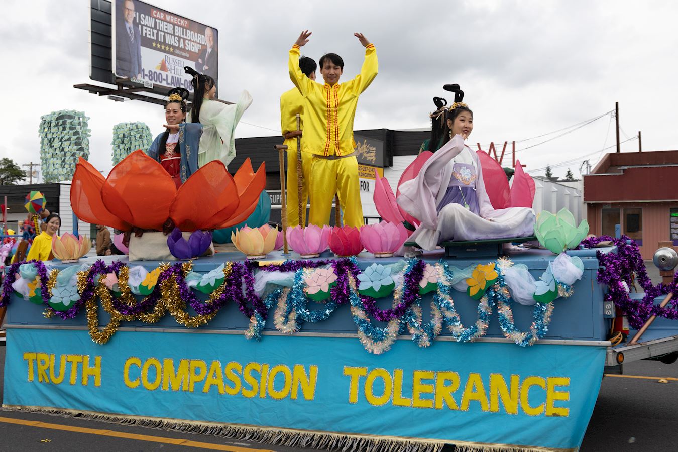 法輪功學員的花車被美麗的祥雲和各色花朵精心點綴,數朵大蓮花從花叢中升起。花車上的法輪功學員們有的展示著五套緩、慢、圓的功法,有的向觀眾們揮手微笑致意,他們發出的純正能量透過了久遠的時空,開啟著人們內心深處對真、善、忍的渴望。
