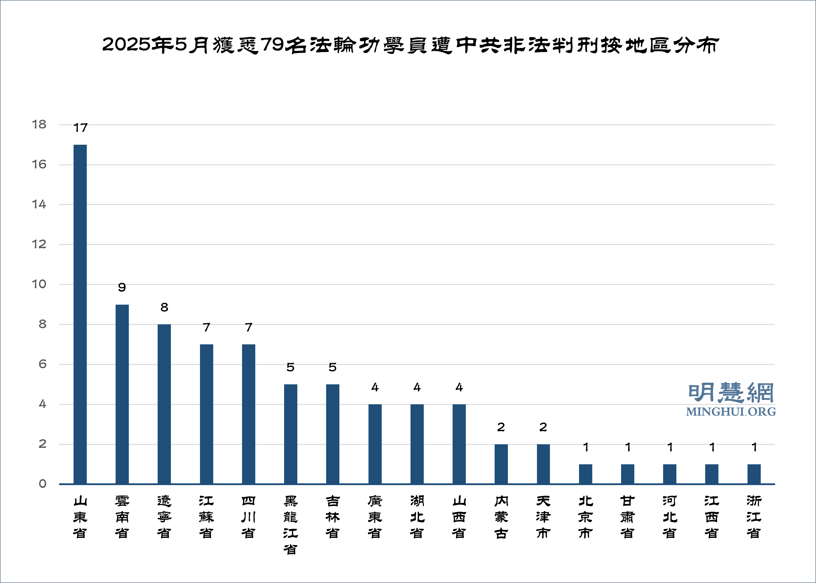 ![]() 圖2:2025年5月獲悉79名法輪功學員遭中共非法判刑按地區分布 |