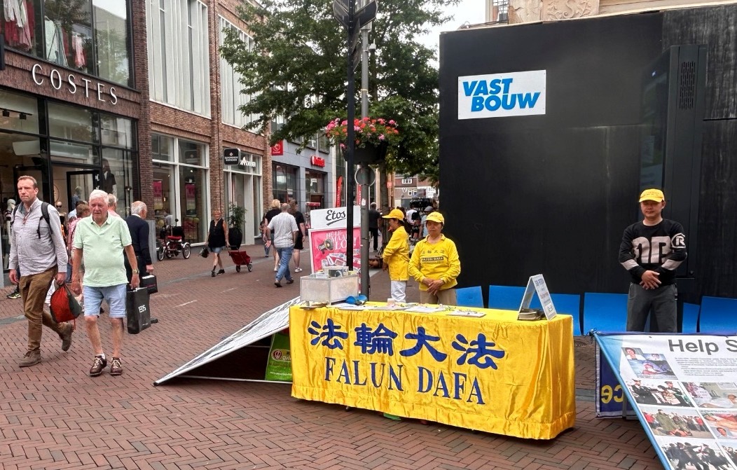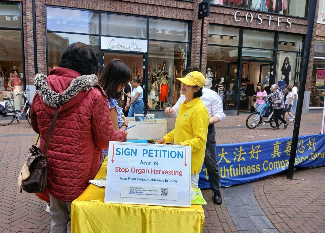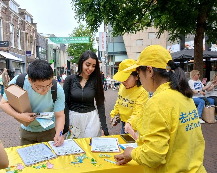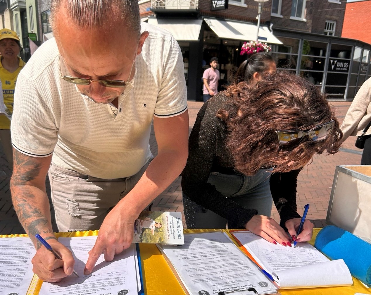 一位先生簽名支持法輪功學員反迫害後,熱烈地與學員交談,說週日還有開放日,邀請學員們第二天繼續來舉辦活動。他指著真相傳單上《轉法輪》圖片問學員在哪裏可以找到這本書,學員告訴他網上可以免費下載閱讀。之後,他還想學習法輪功功法,學員幫他找到荷蘭煉功點的地址後,他才慢慢離開。