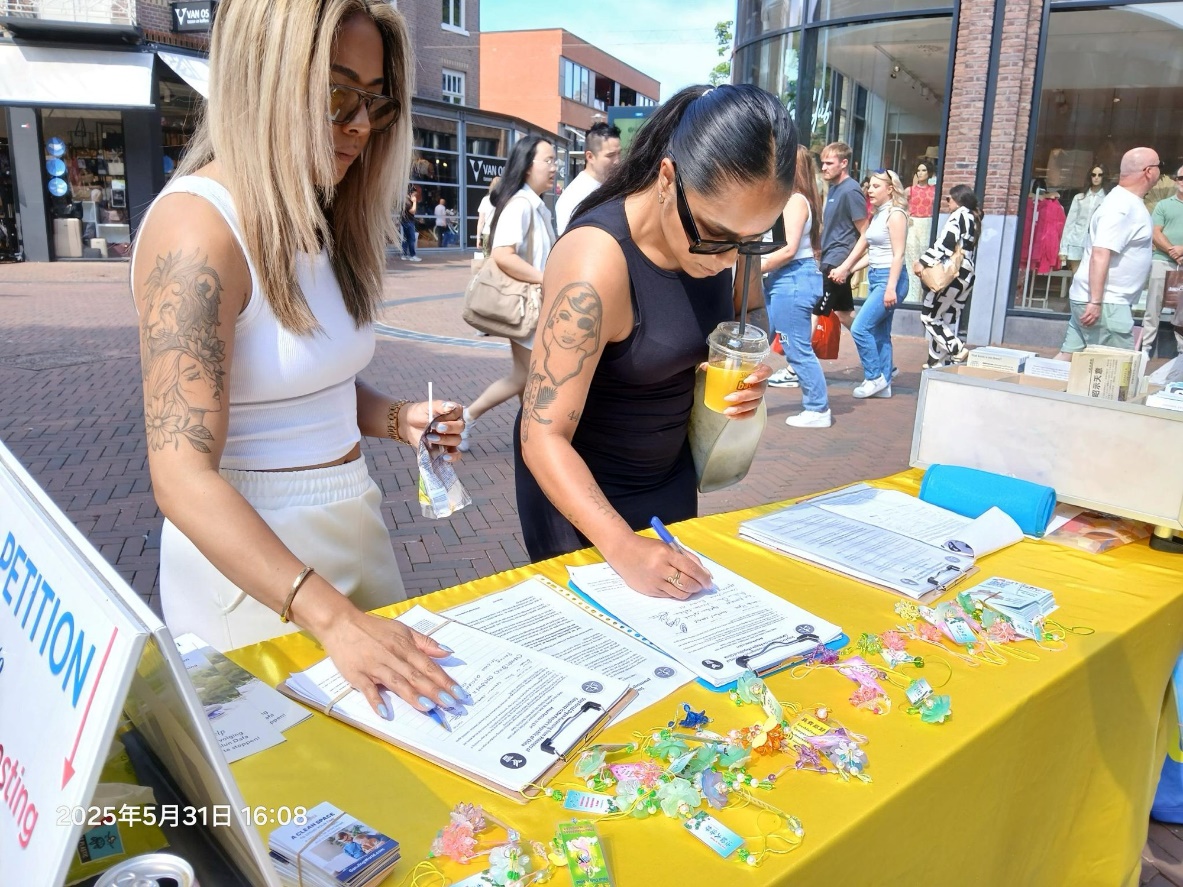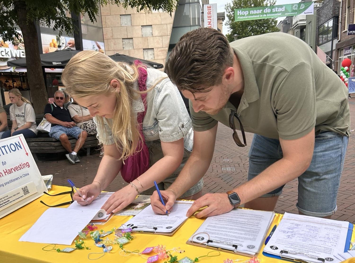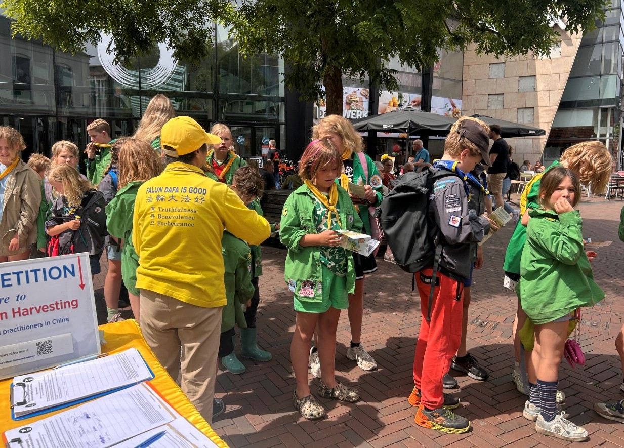 一位先生簽名支持法輪功學員反迫害後,熱烈地與學員交談,說週日還有開放日,邀請學員們第二天繼續來舉辦活動。他指著真相傳單上《轉法輪》圖片問學員在哪裏可以找到這本書,學員告訴他網上可以免費下載閱讀。之後,他還想學習法輪功功法,學員幫他找到荷蘭煉功點的地址後,他才慢慢離開。