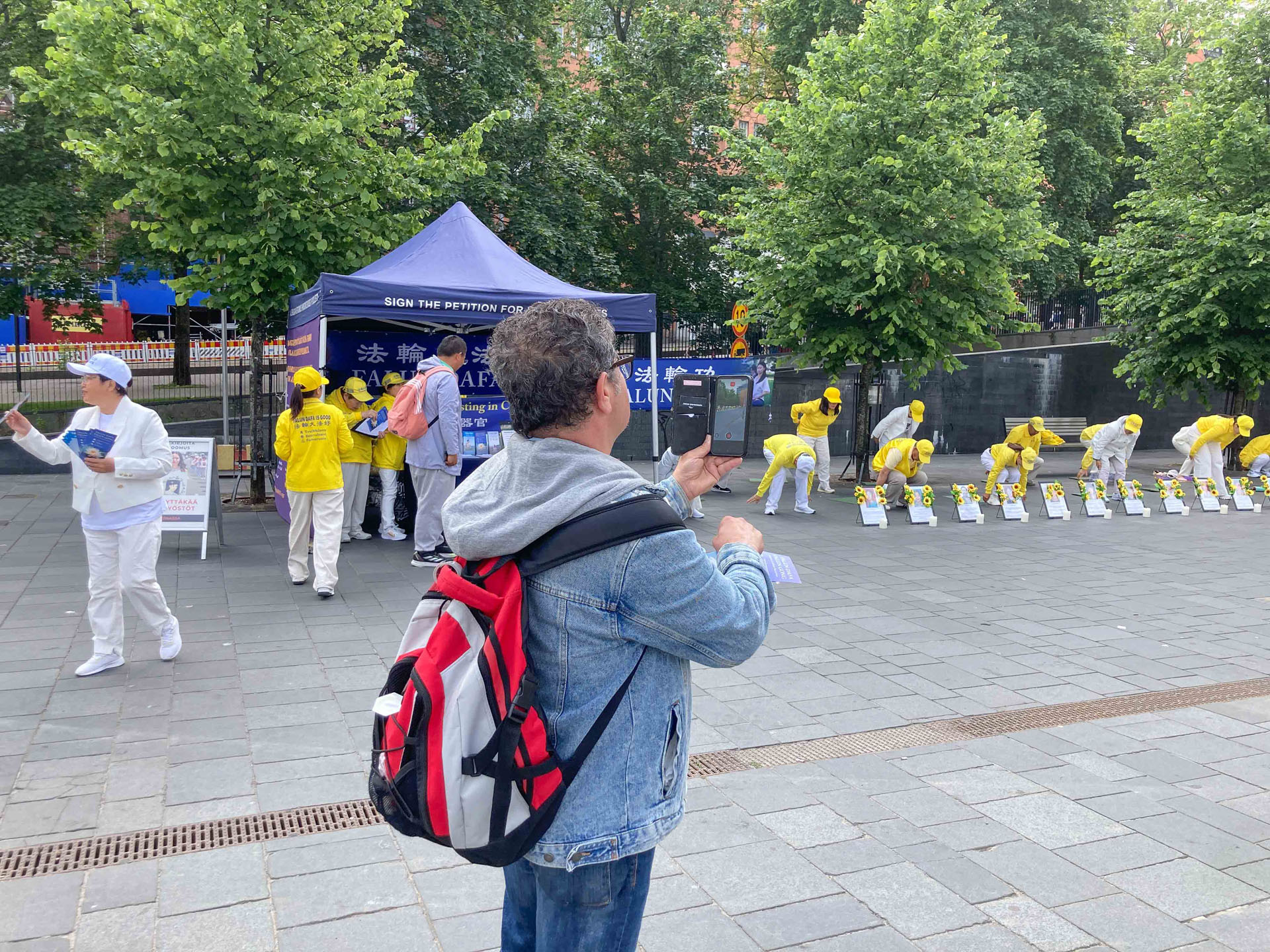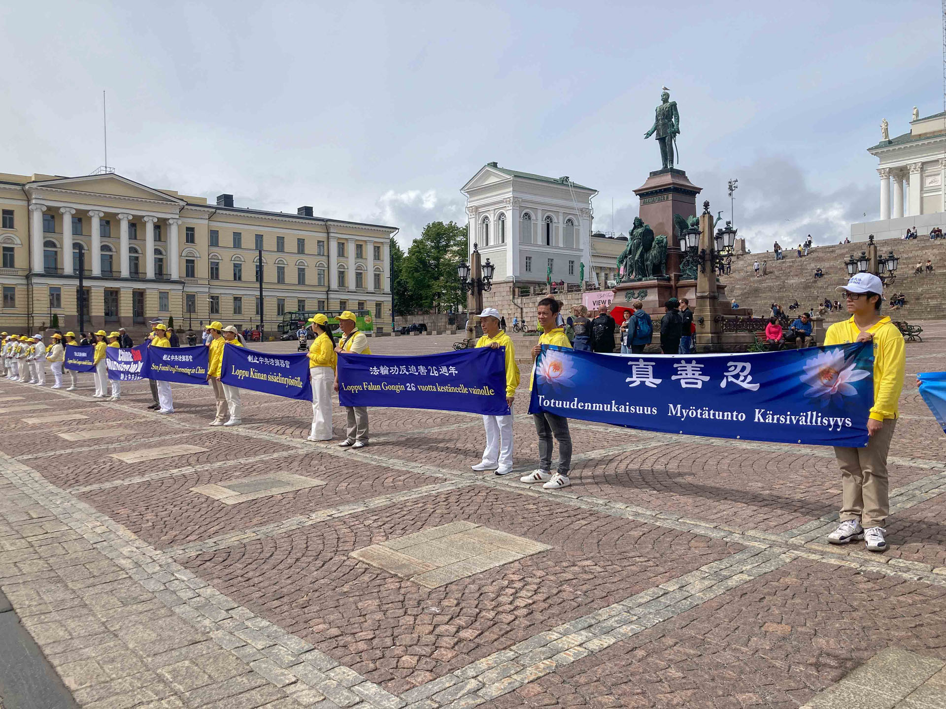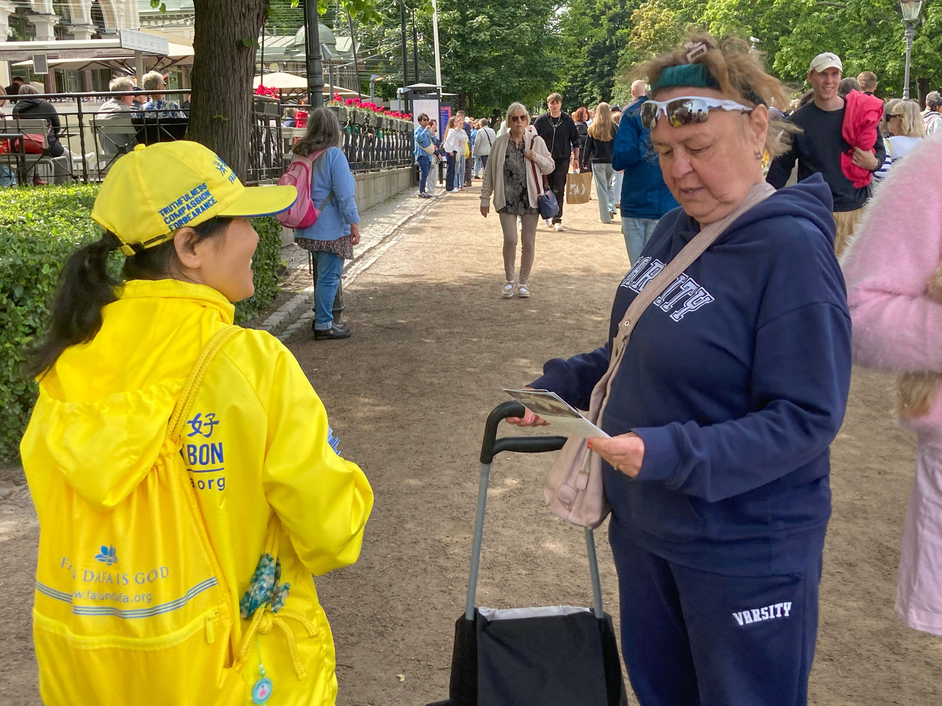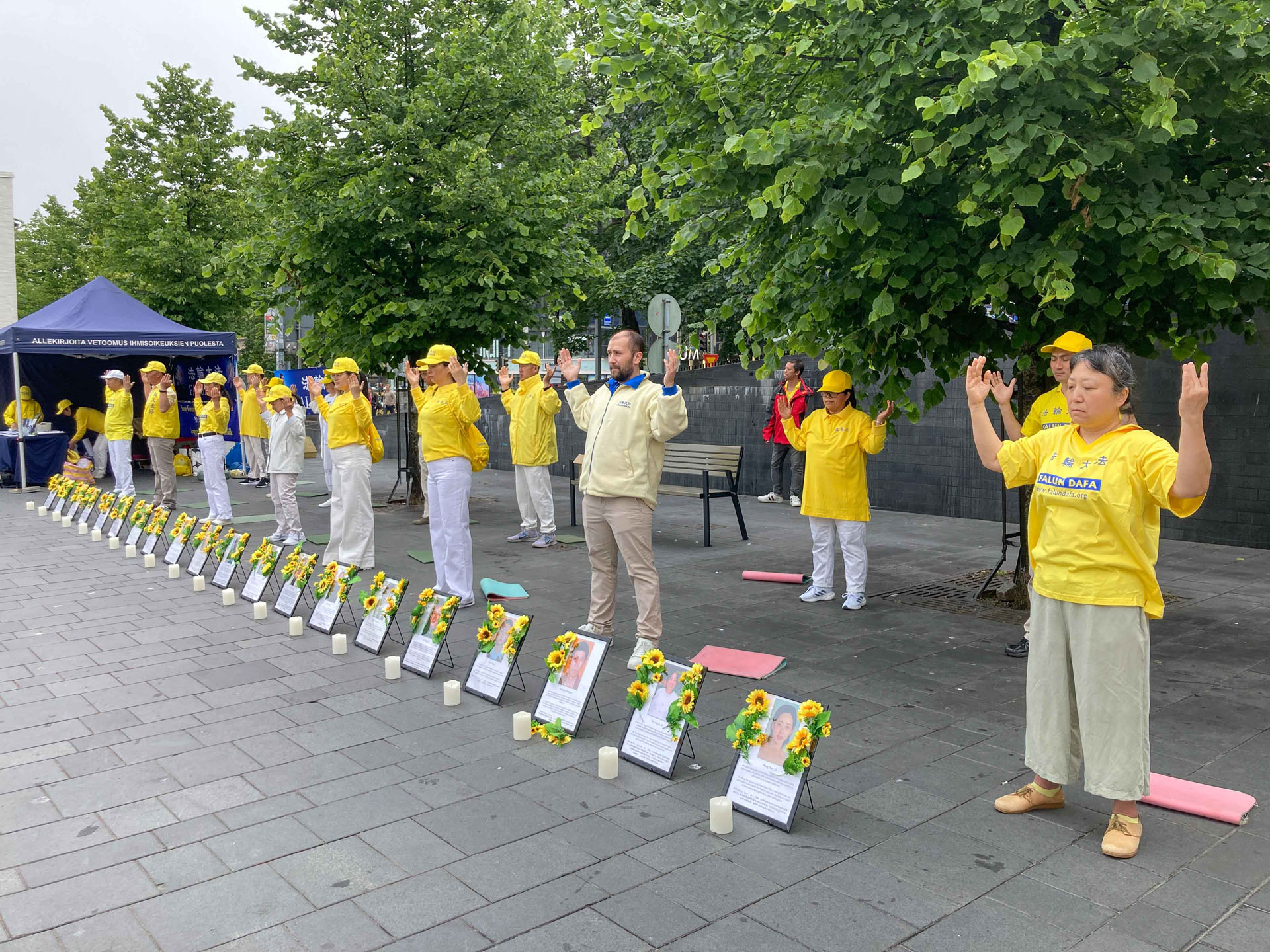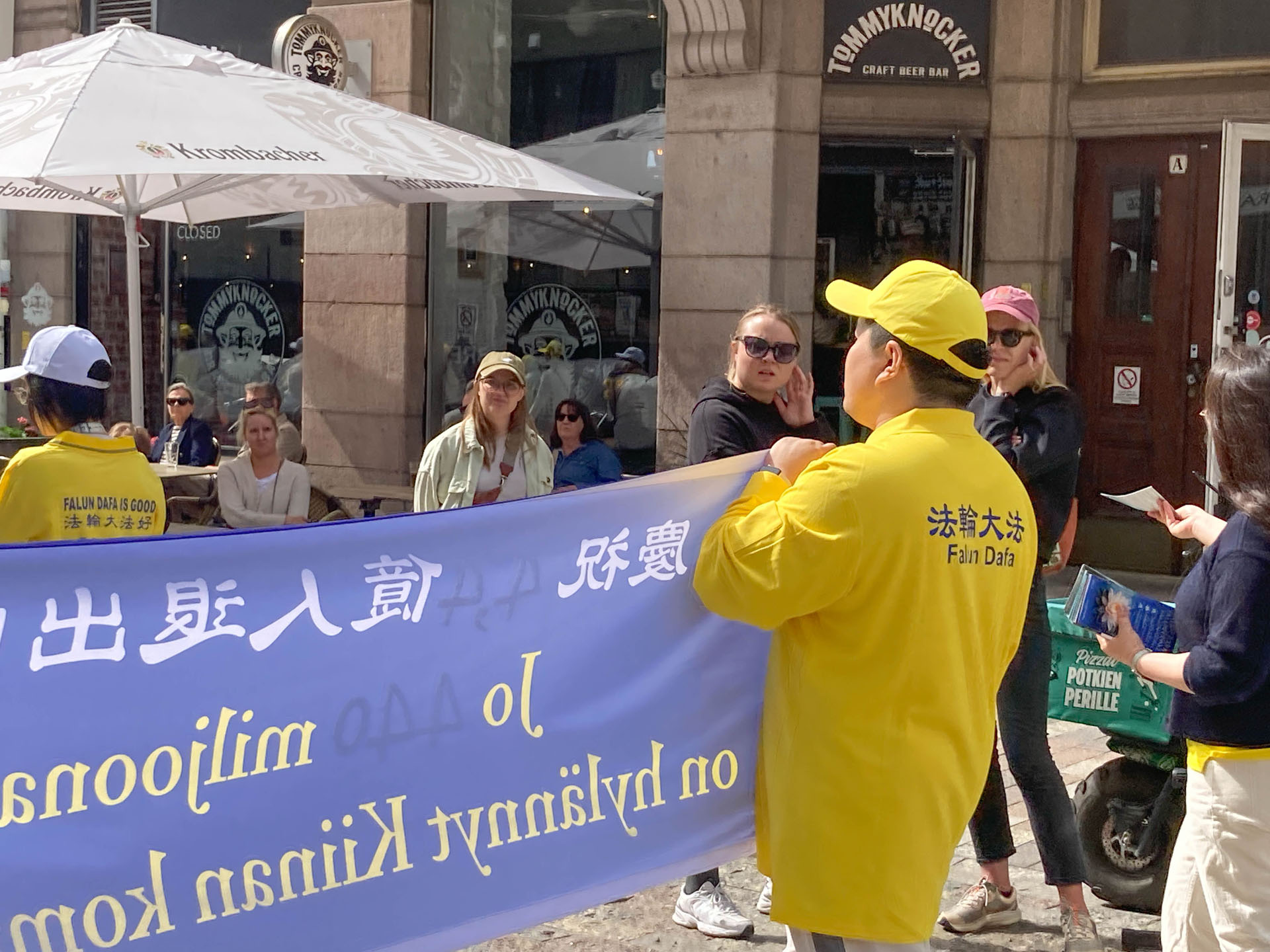 雖然天氣預報原本預測會下雨,但當天天氣晴朗。活動開始前,學員們在甘比(Kamppi)廣場附近的空地上集體煉功,展示法輪功祥和優美的功法。吸引許多路人駐足觀看,並向學員詢問相關信息,了解事實真相。