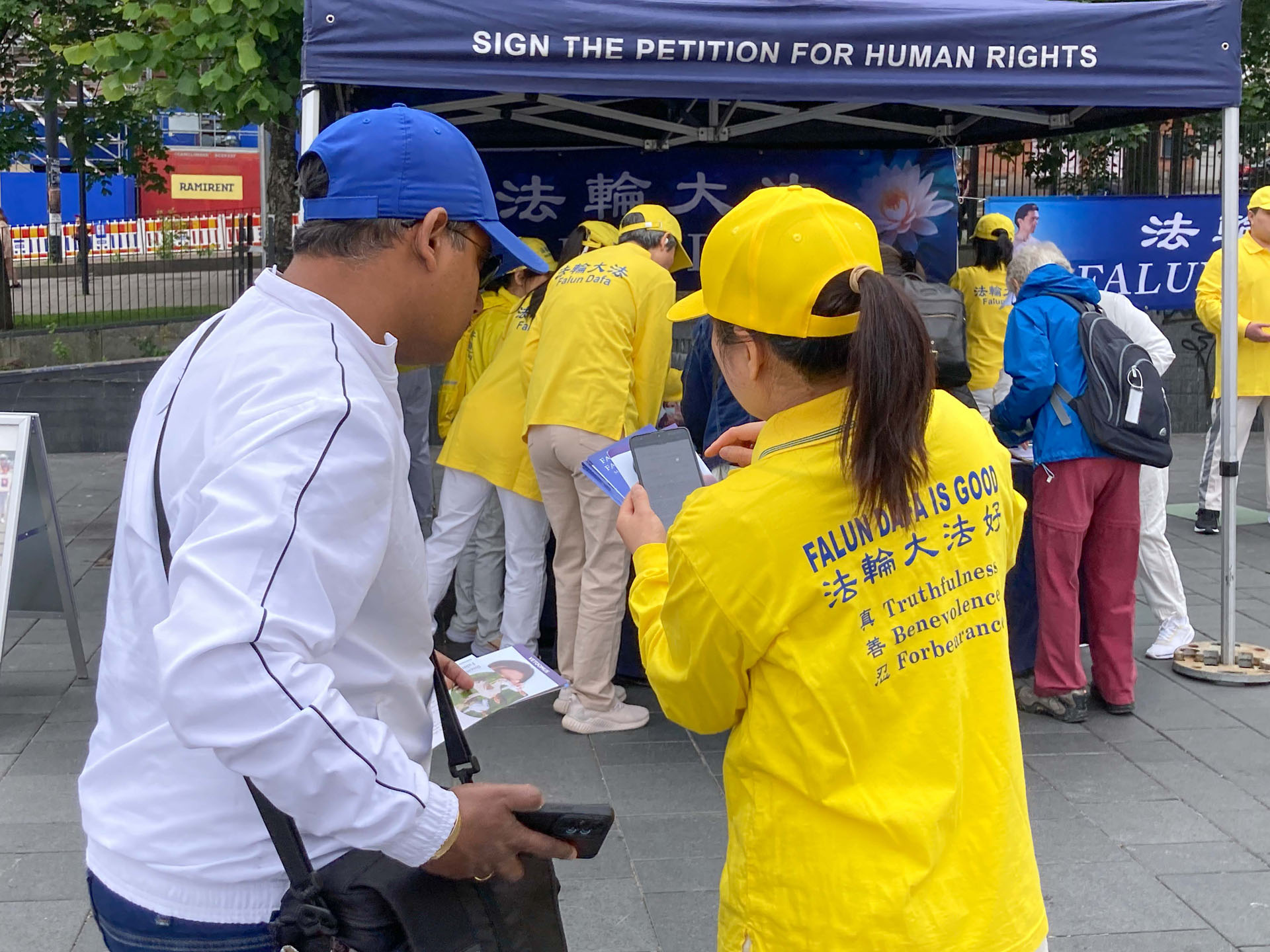 在甘比的信息點,民眾看到被迫害致死的法輪功學員遺像後,主動上前簽名,表達對反迫害的支持。