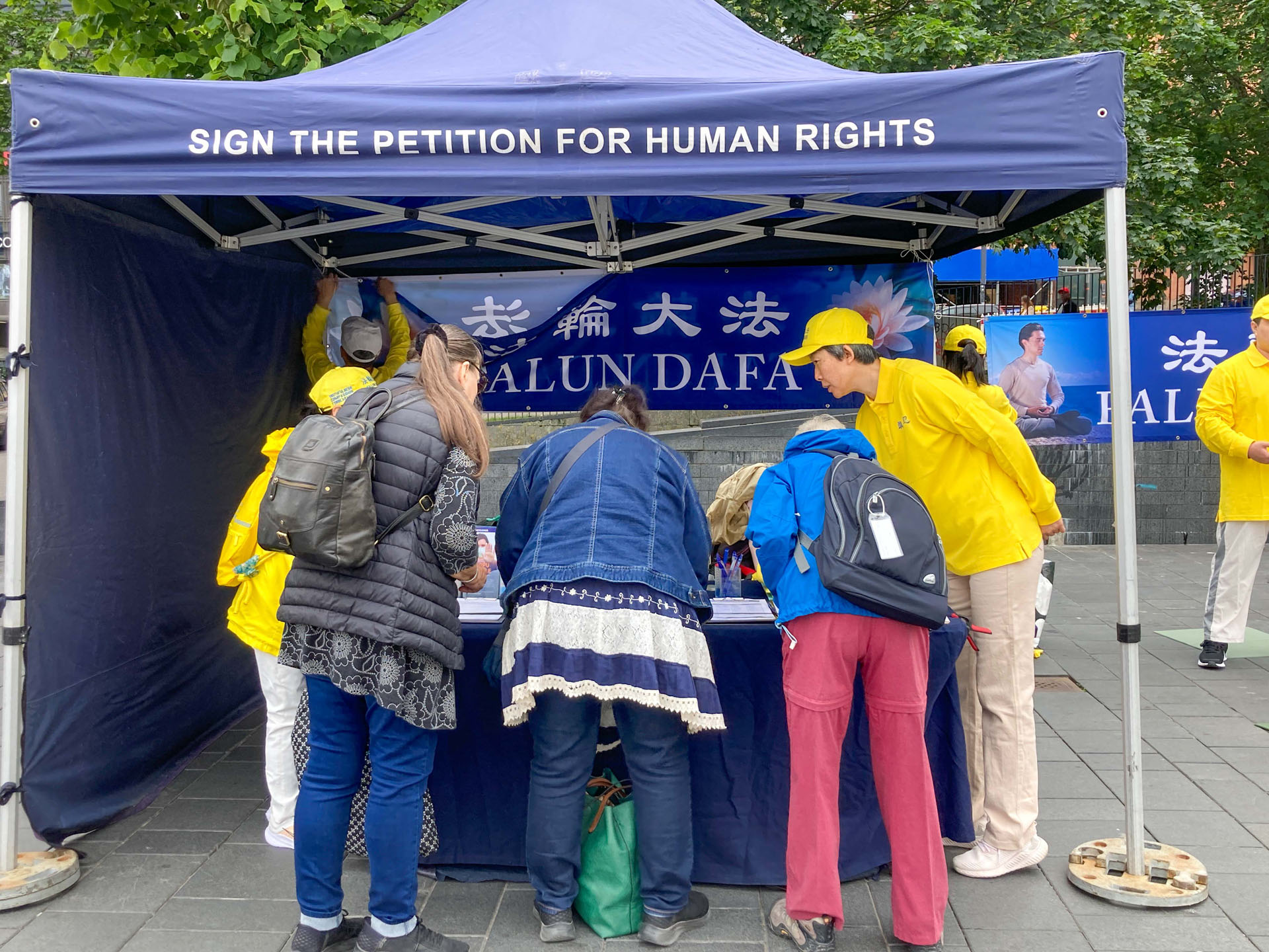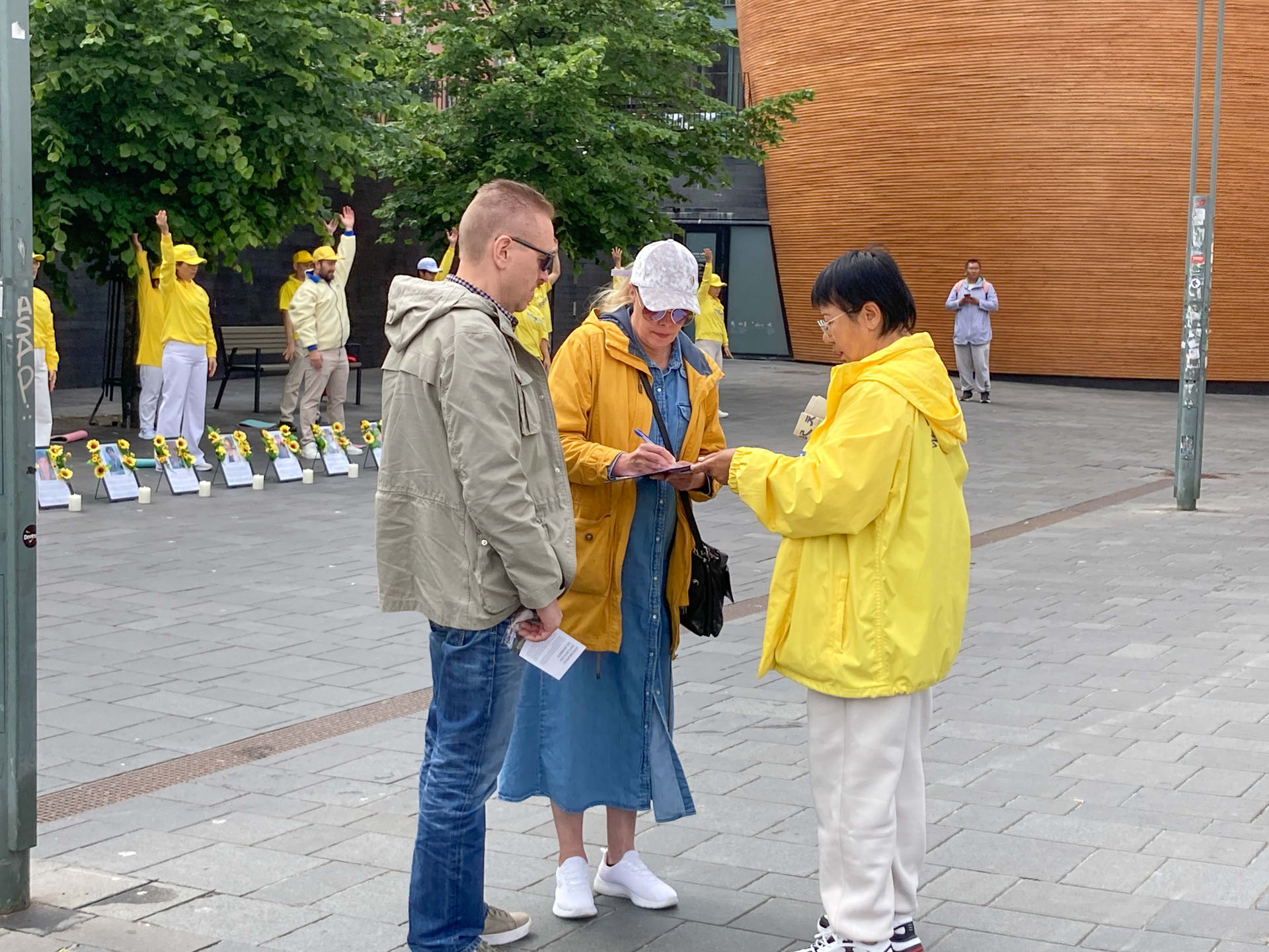艾莉娜(Elina) 和弗雷德裏克(Fredrik)騎著自行車路過後,停下來簽名支持中國人權。「這種事情應該在全世界範圍內被制止。」弗雷德裏克說:「我聽說過中國境內活摘器官的事,人民在監獄裏被摘取器官,真的太可怕了。」